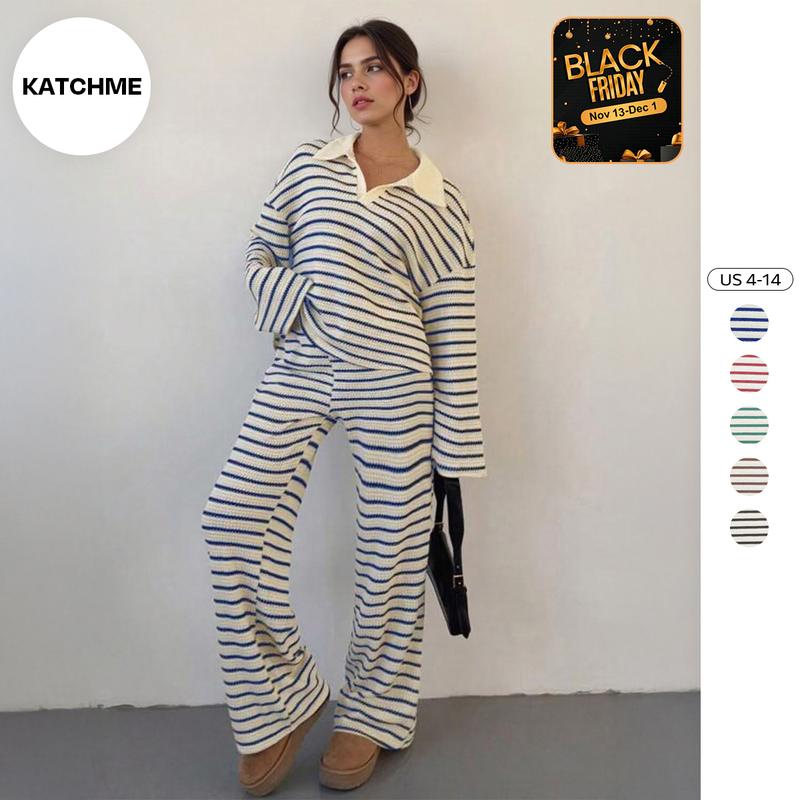KatchMe Women's Casual Color Matching Stripe Long Sleeve Top & Wide Leg Trousers Co-ord, Soft V-Neck Loose Two Piece Outfits, Comfortable Womenswear #BlackFriday#