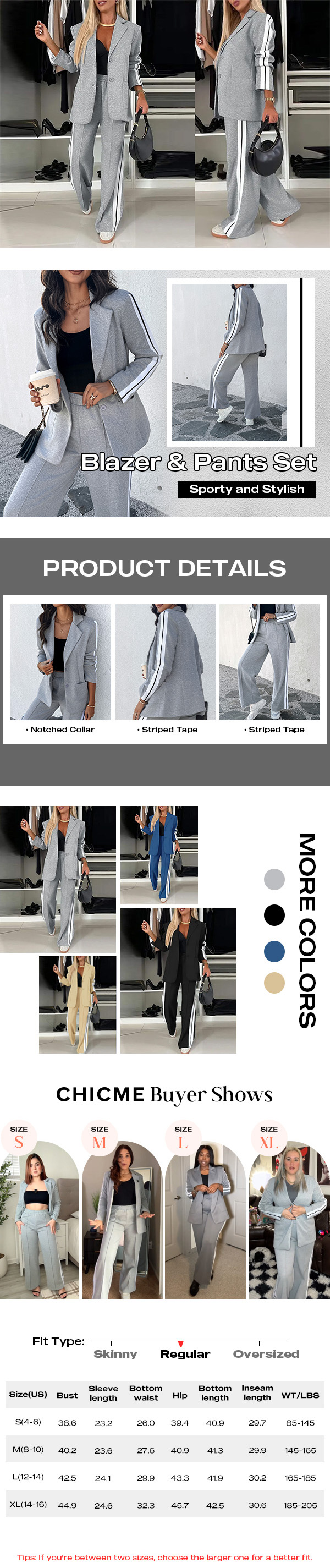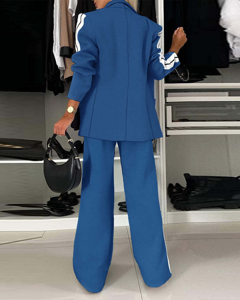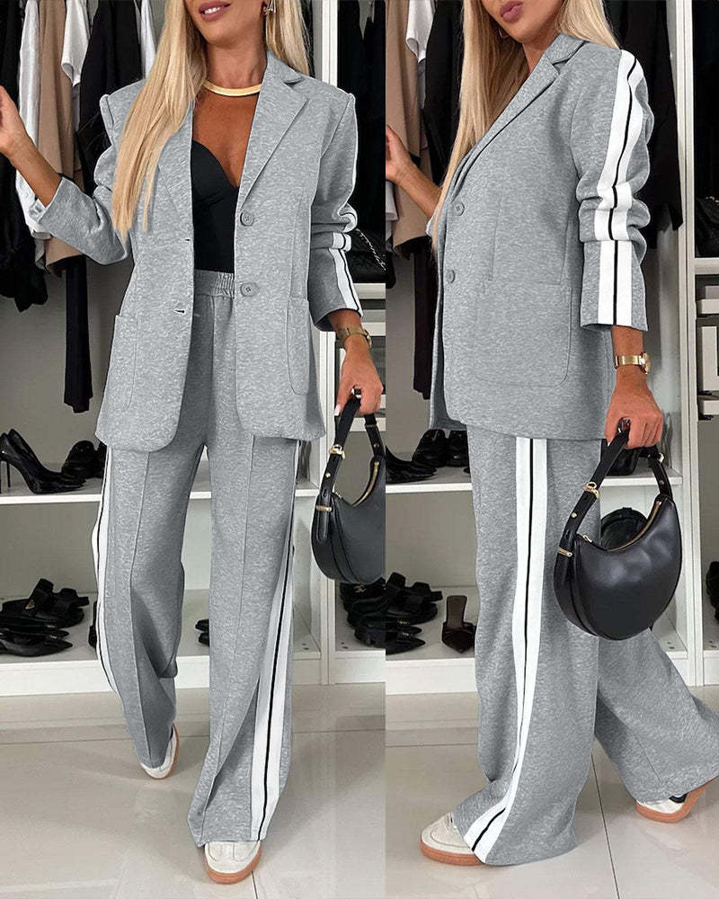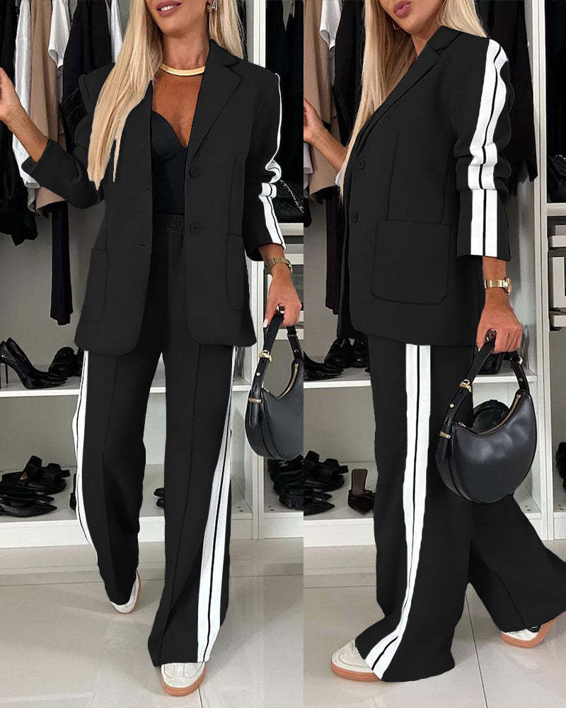 2 Pieces Outfit Notched Collar Single Breasted Pockets Design Coat And Elastic Waist Seam Front Wide Leg Pants Set Casual Contrast Side Striped Blazer Set