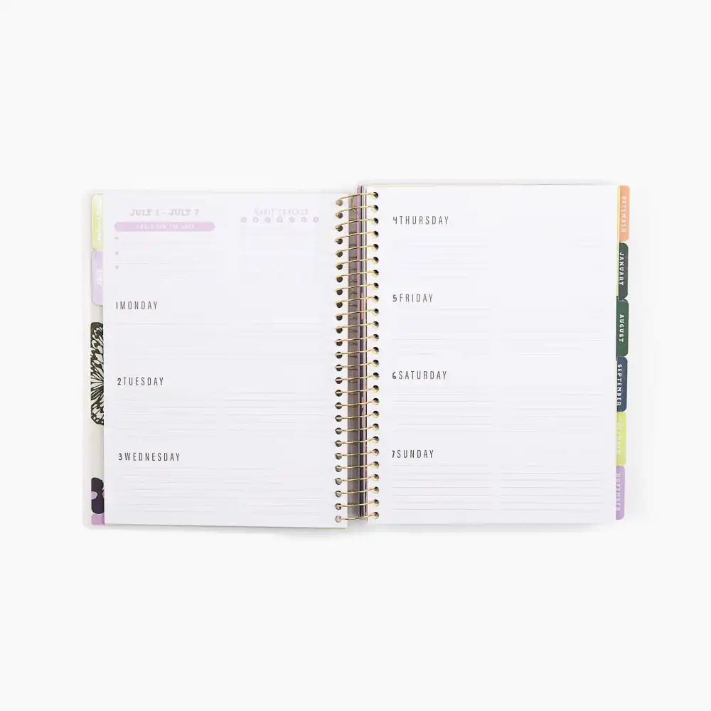 - Monthly calendar overview page followed by weekly spread.