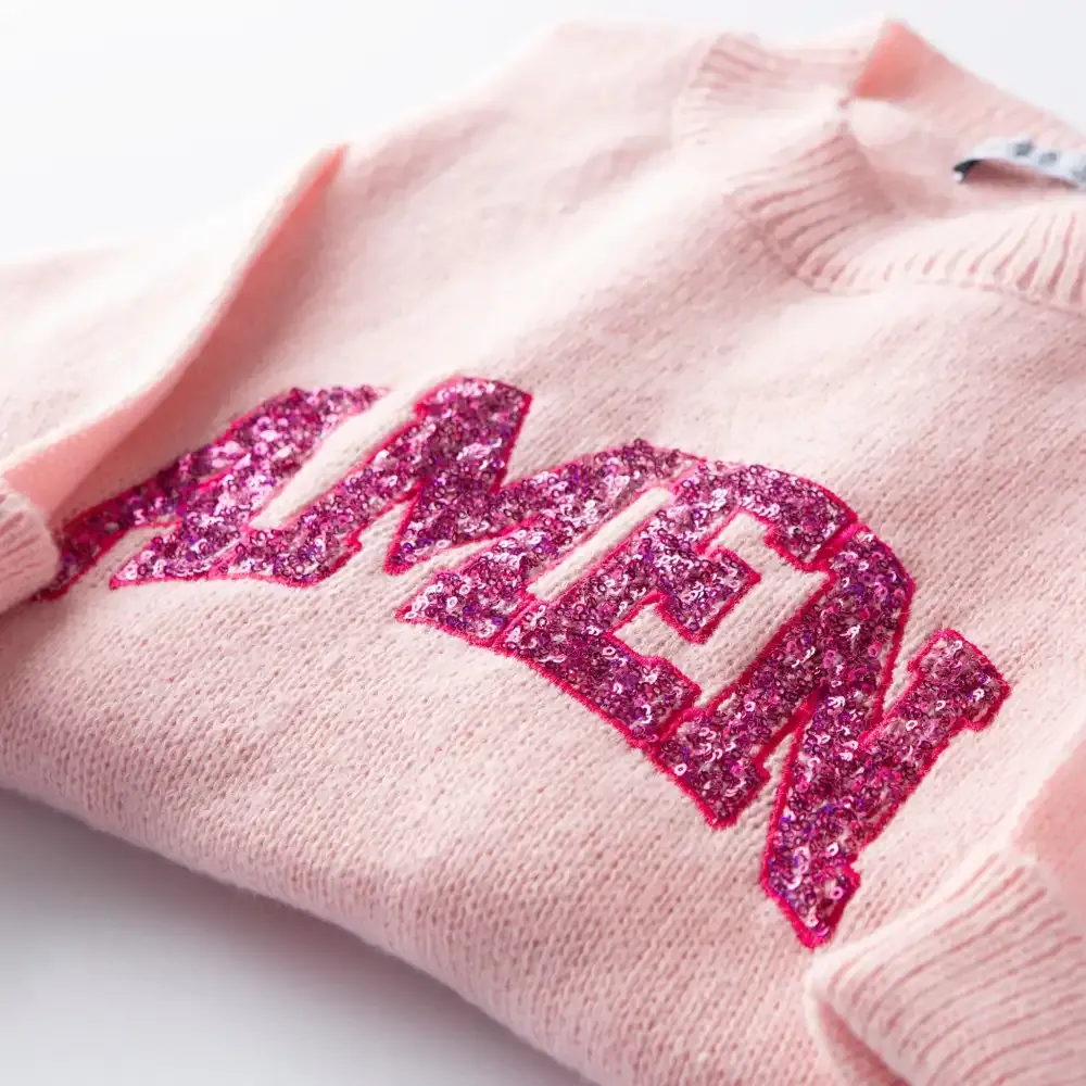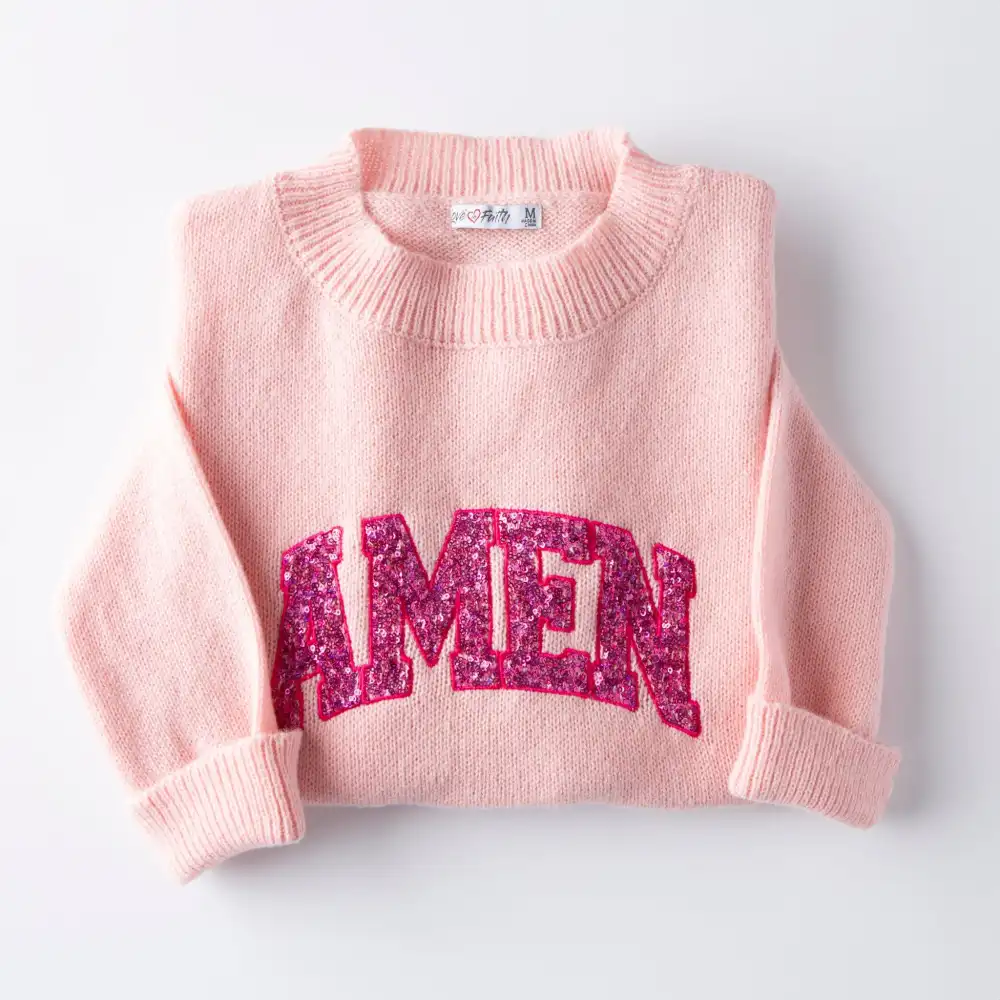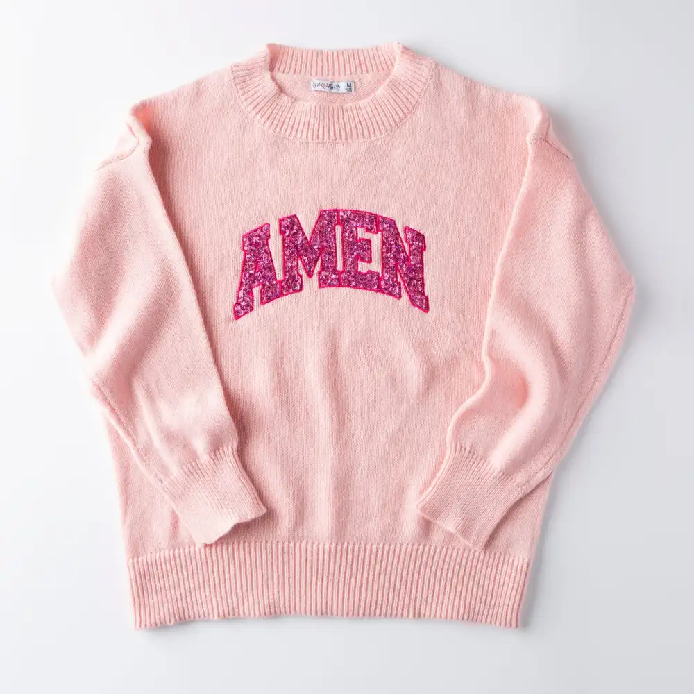 Amen! It's an affirmation of faith, sealing our prayers with trust in God’s perfect will. May your heart echo this confidence as you wrap yourself in cozy elegance with our Amen Embellished Sweater. Whether you pair it with jeans for a casual look or dress it up with a skirt, you can share your faith with effortless sophistication.