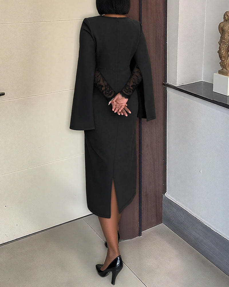 Asymmetrical Foldover Neck Lace Long Sleeve with Split Sleeve Overlay Party Dress Slim Fit Zipper Back Slit Commuting Dress