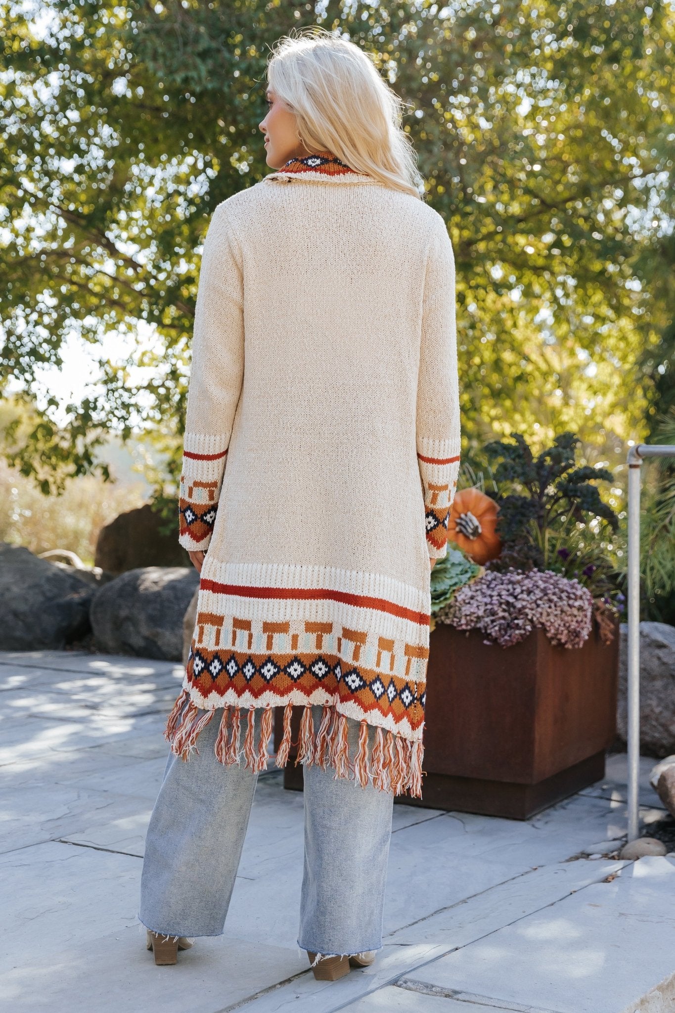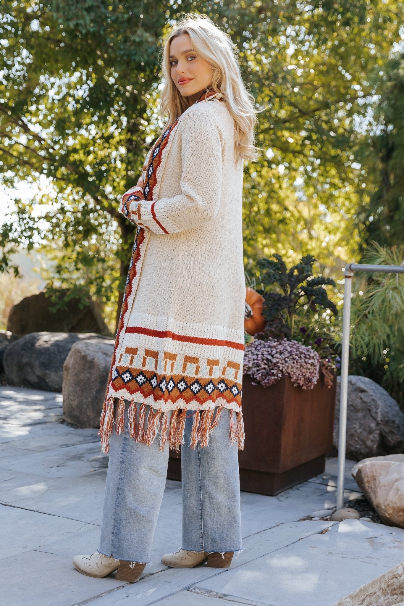 Beige Tribal Print Fringe Duster Cardigan