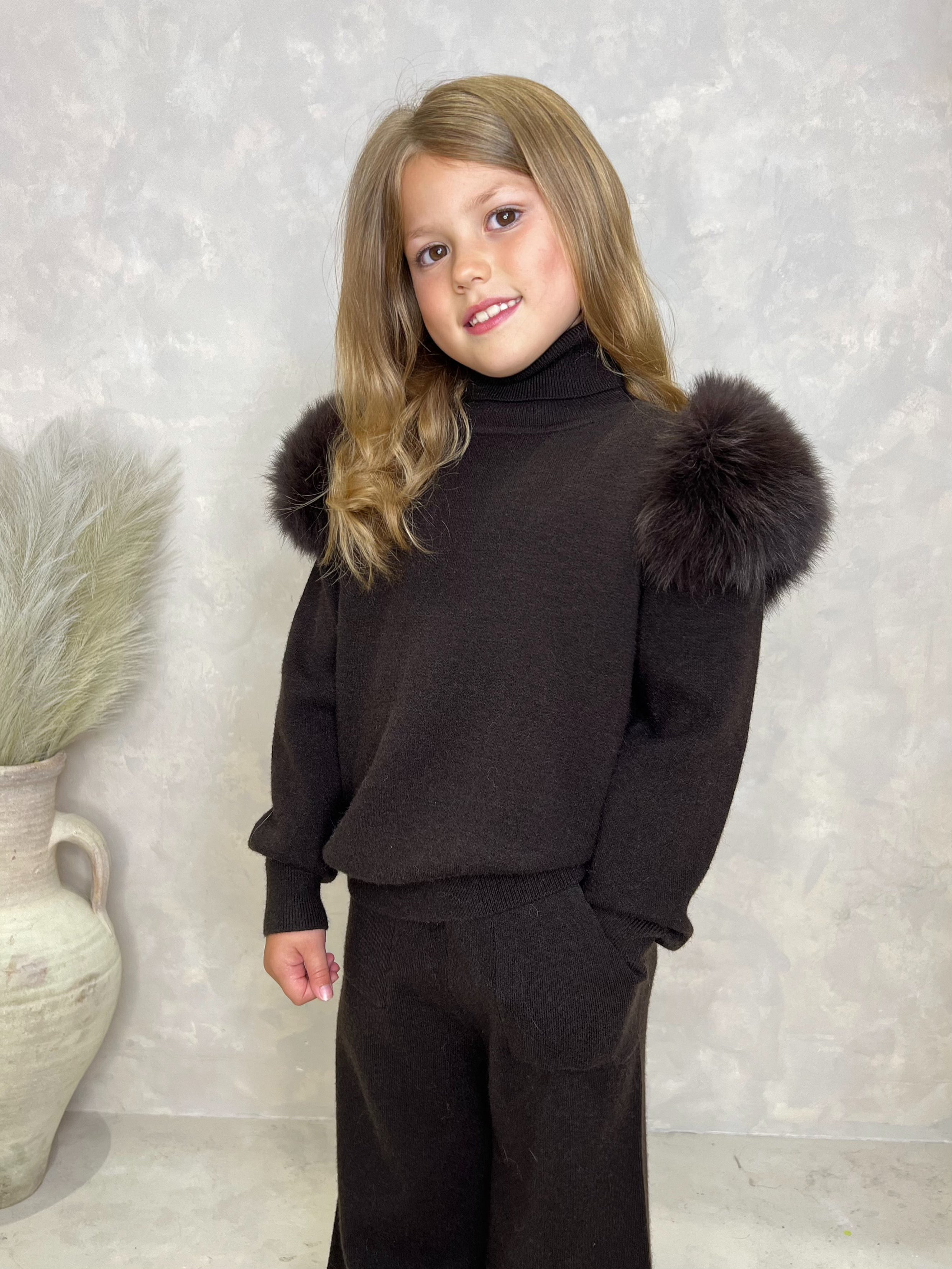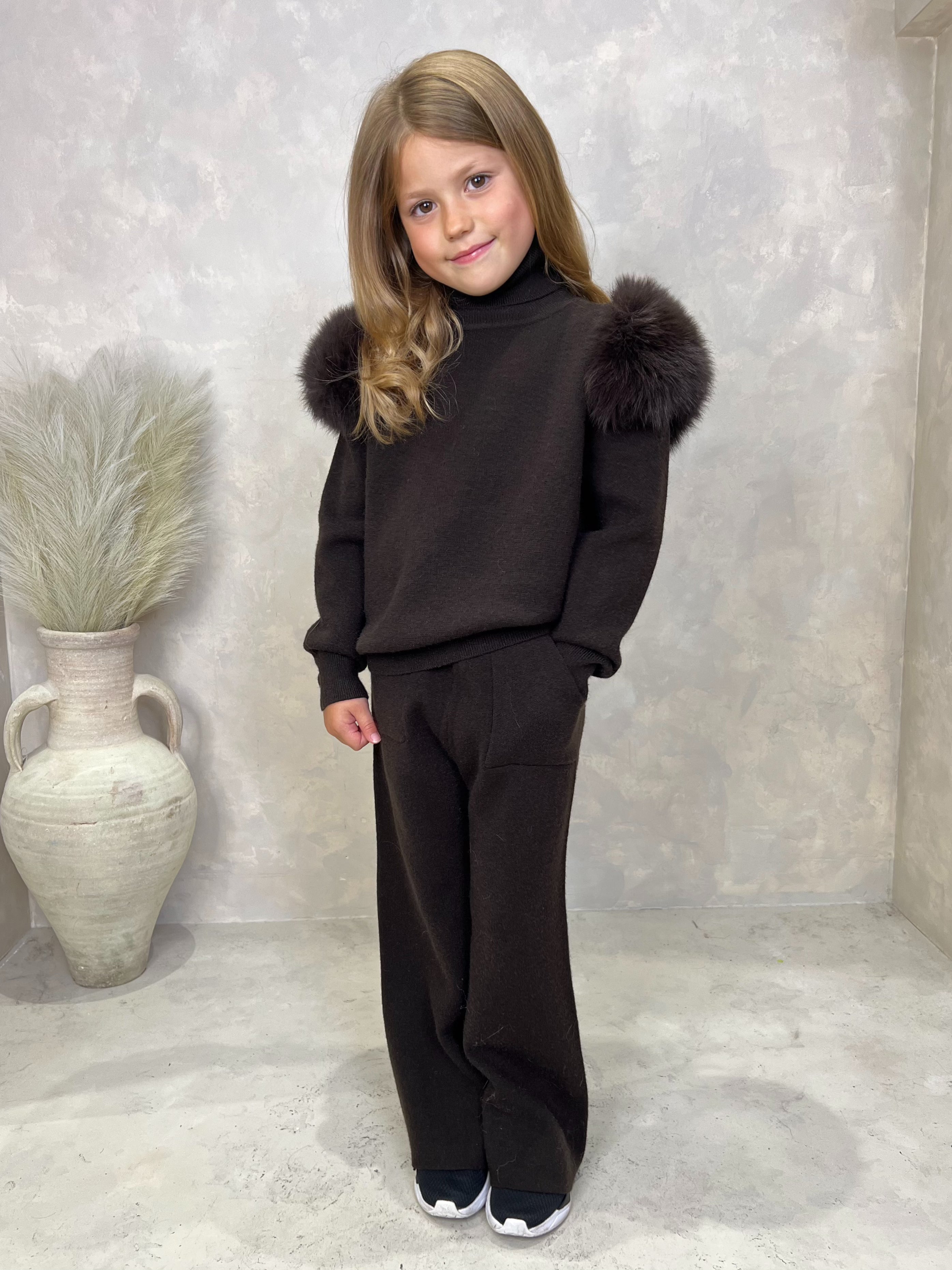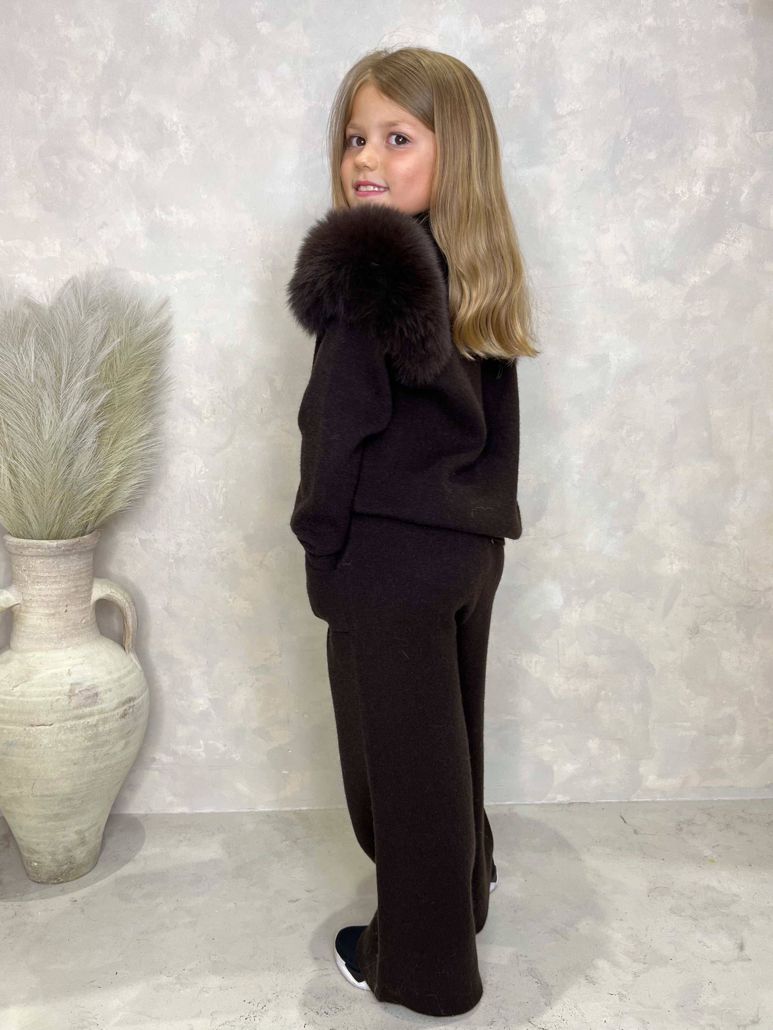 This Kids Luxury Fur Wide Leg Tracksuit features a detachable fur shoulder for added versatility and style. The wide leg design adds a touch of comfort and the stylish roll neck keeps your little one warm and cozy. Made with high quality fox fur for a luxurious look and feel.