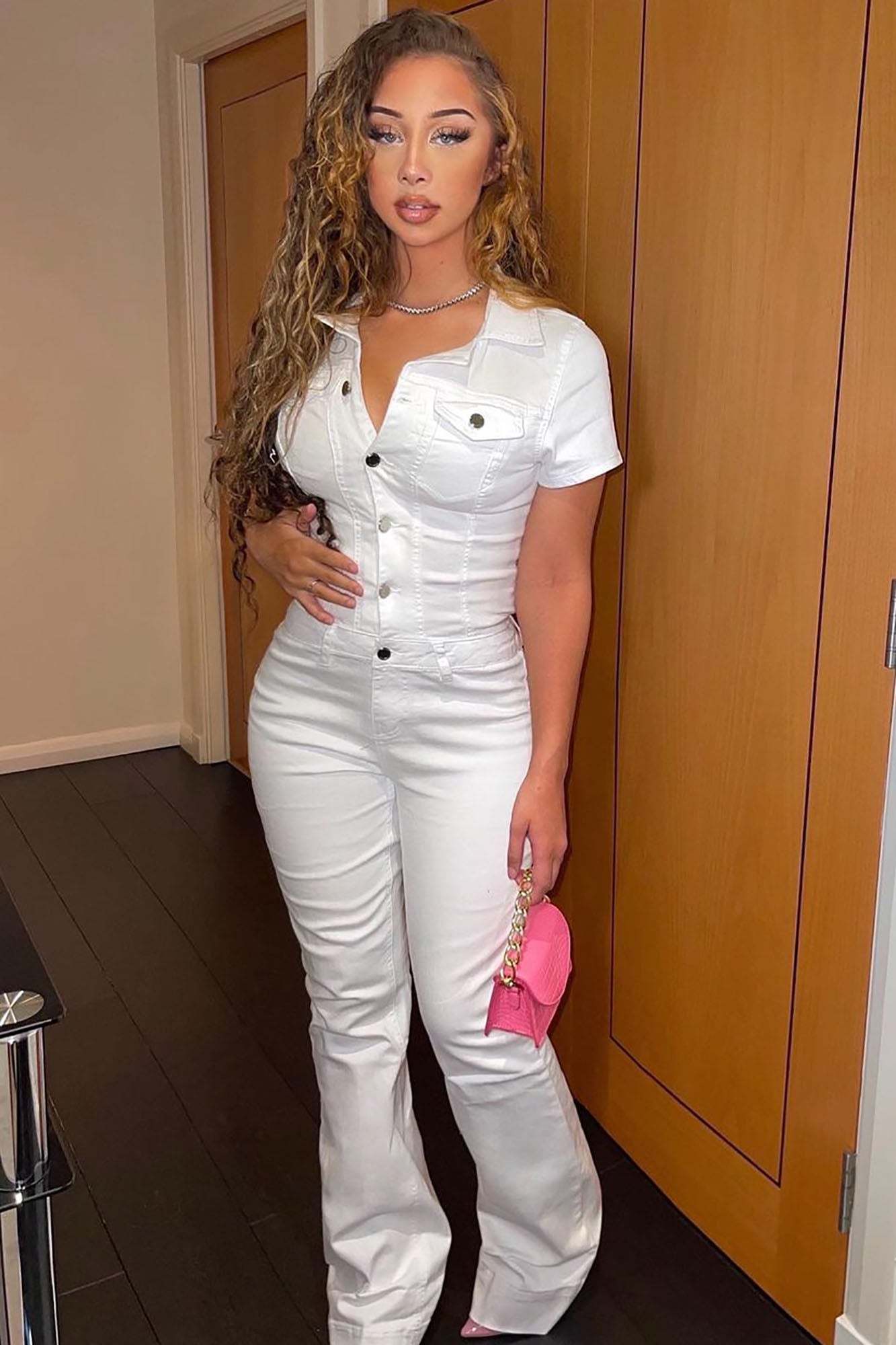 Available In Denim And White.Denim JumpsuitCollarFunctional Front ButtonsFunctional PocketsWide Leg PantStretch Denim33" InseamDisclaimer: Due To The Specialized Wash Process, Each Garment Is Unique.73% Cotton 25% Polyester 2% SpandexImported