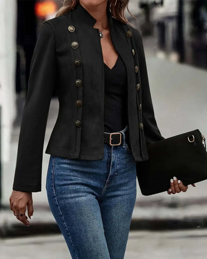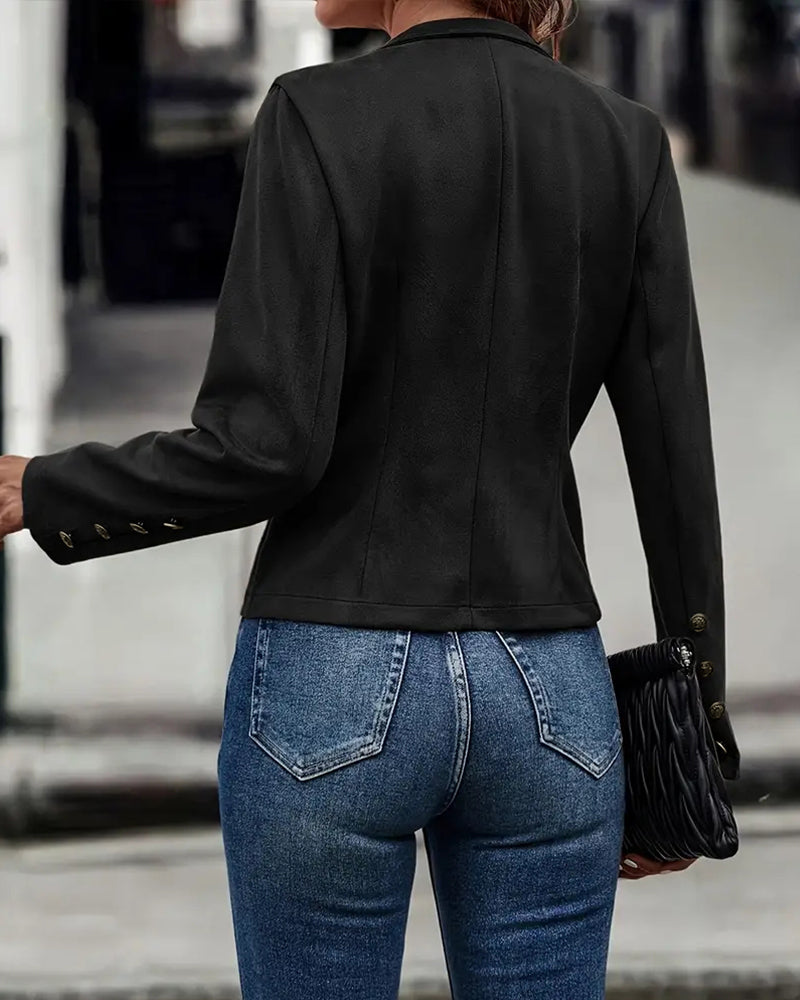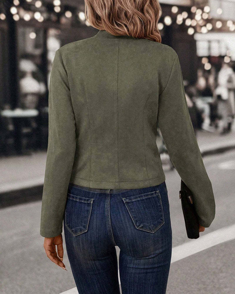 Design Details: Double-breasted decorative buttons highlight the front, adding visual interest without adding bulk. The faux suede surface enhances depth and texture, making the jacket more polished for casual-chic styling.