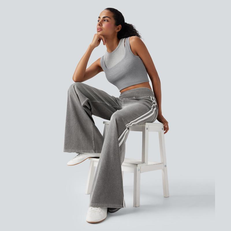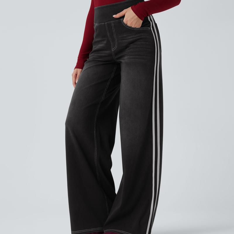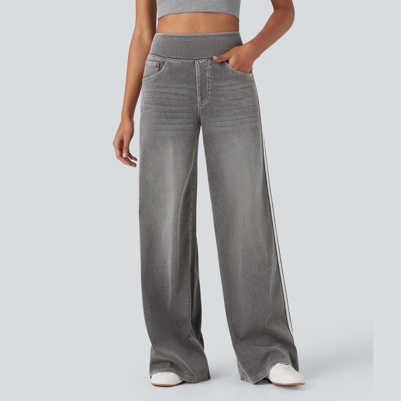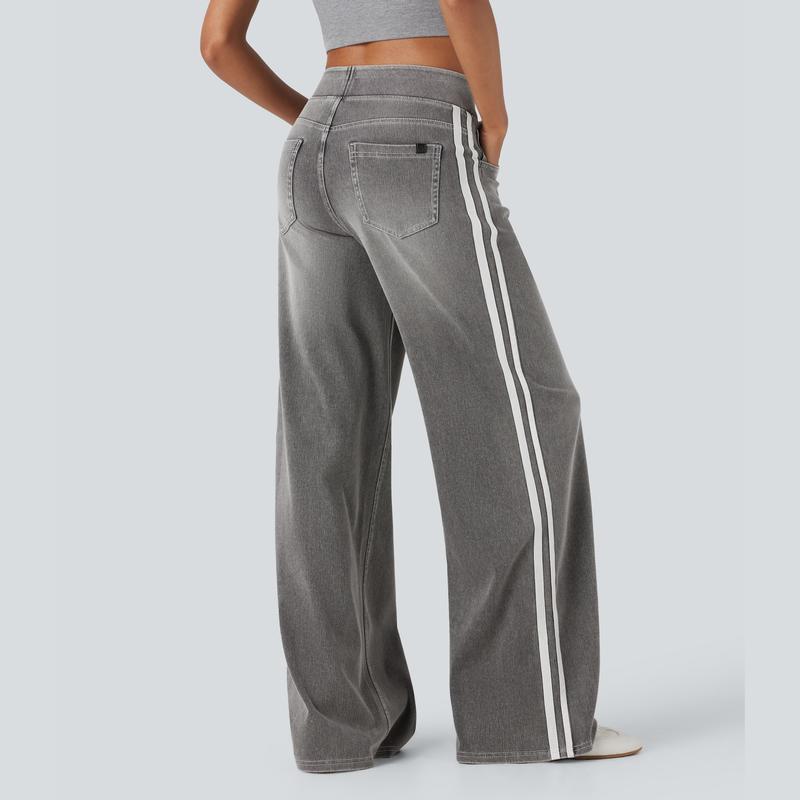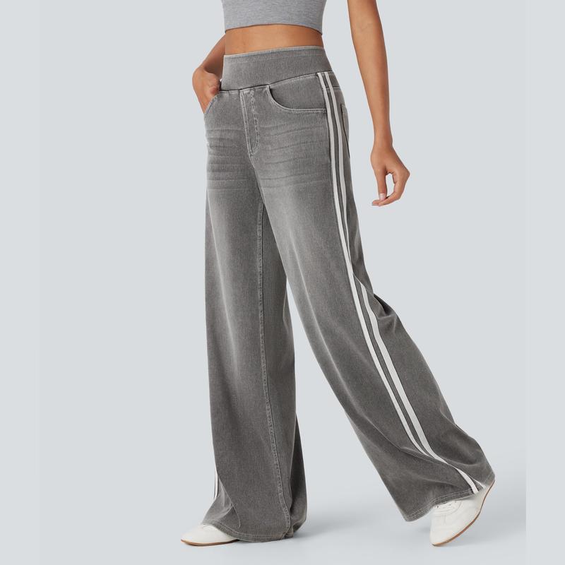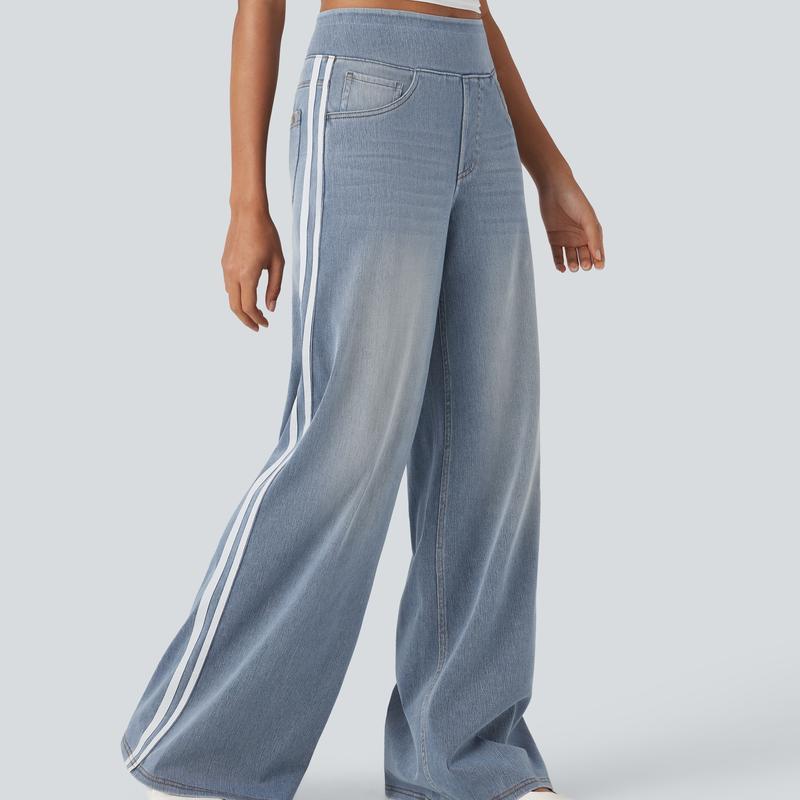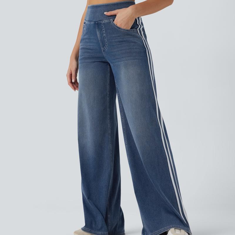 FlexTM High Waisted Stripe Wide Leg Flowy Washed Casual Jeans with Pockets