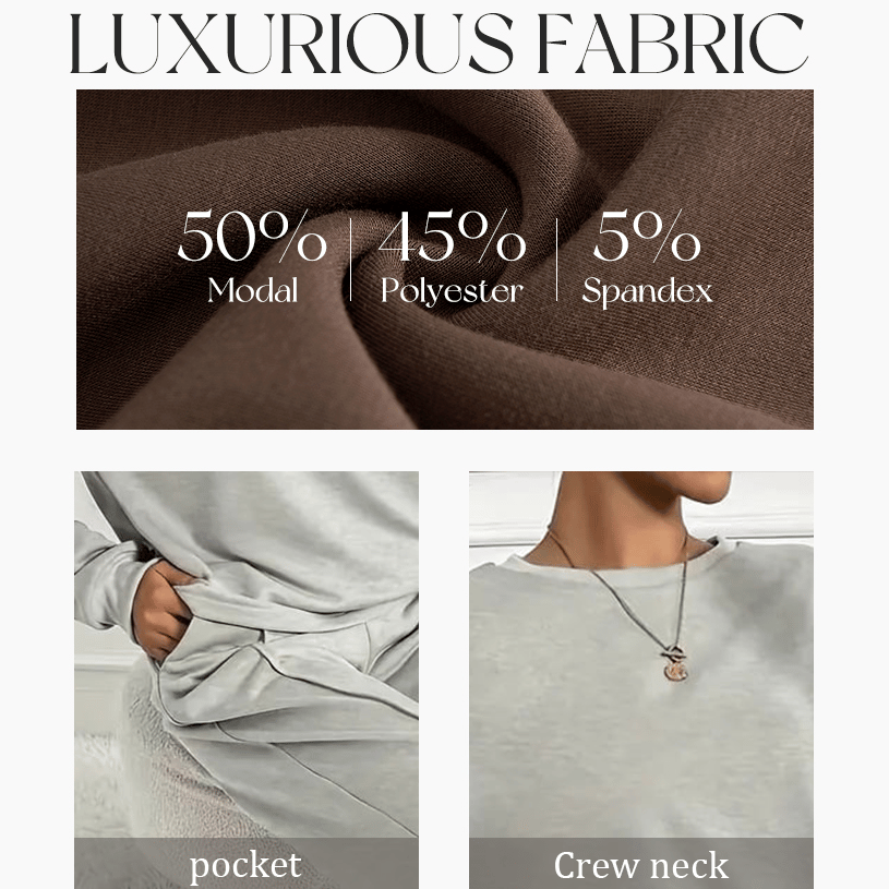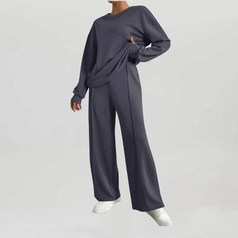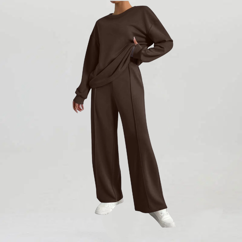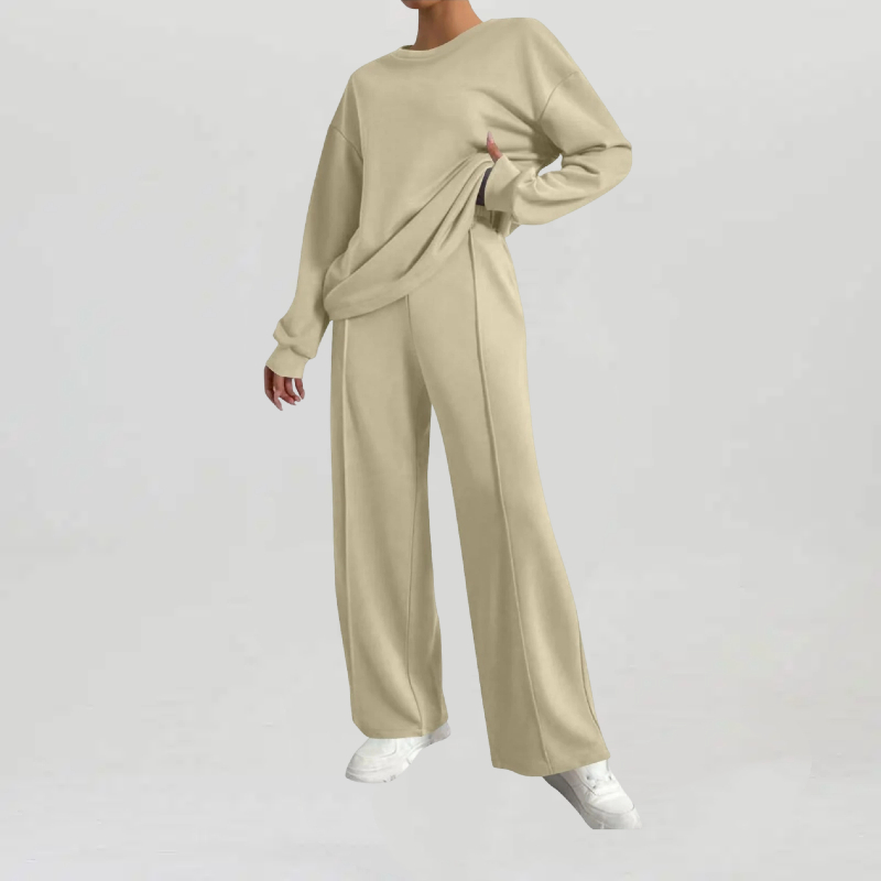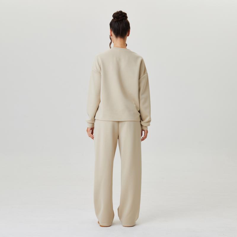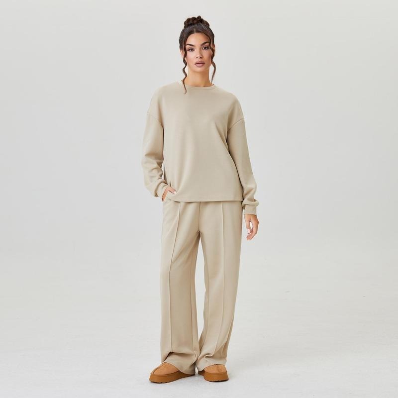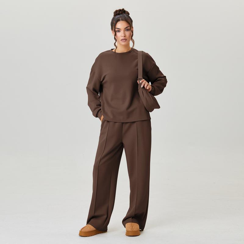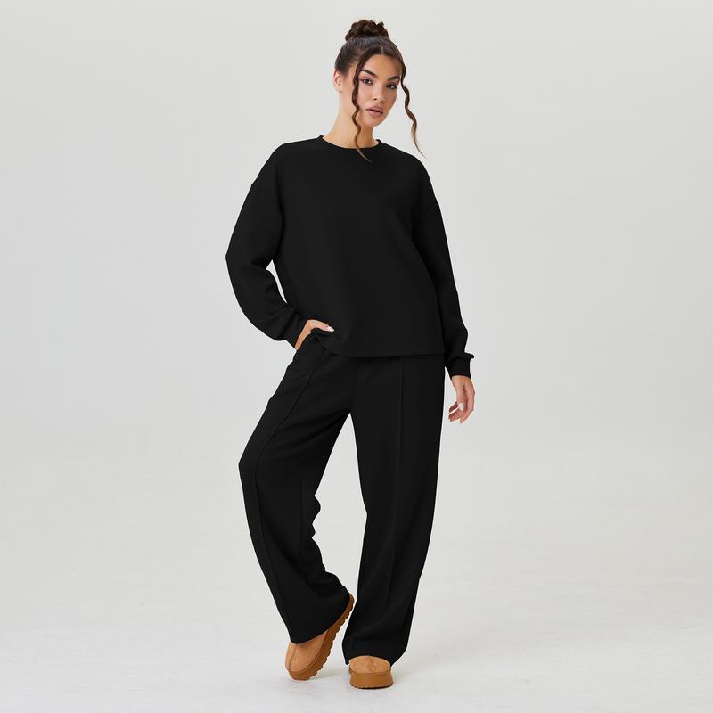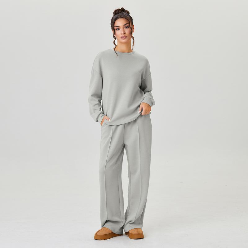 Women's Casual Solid Color Loose Long Sleeve Top & Exposed Stitches Trousers Co-ord, Cozy Round Neck Top & Wide Leg Trousers Two Piece Outfits
