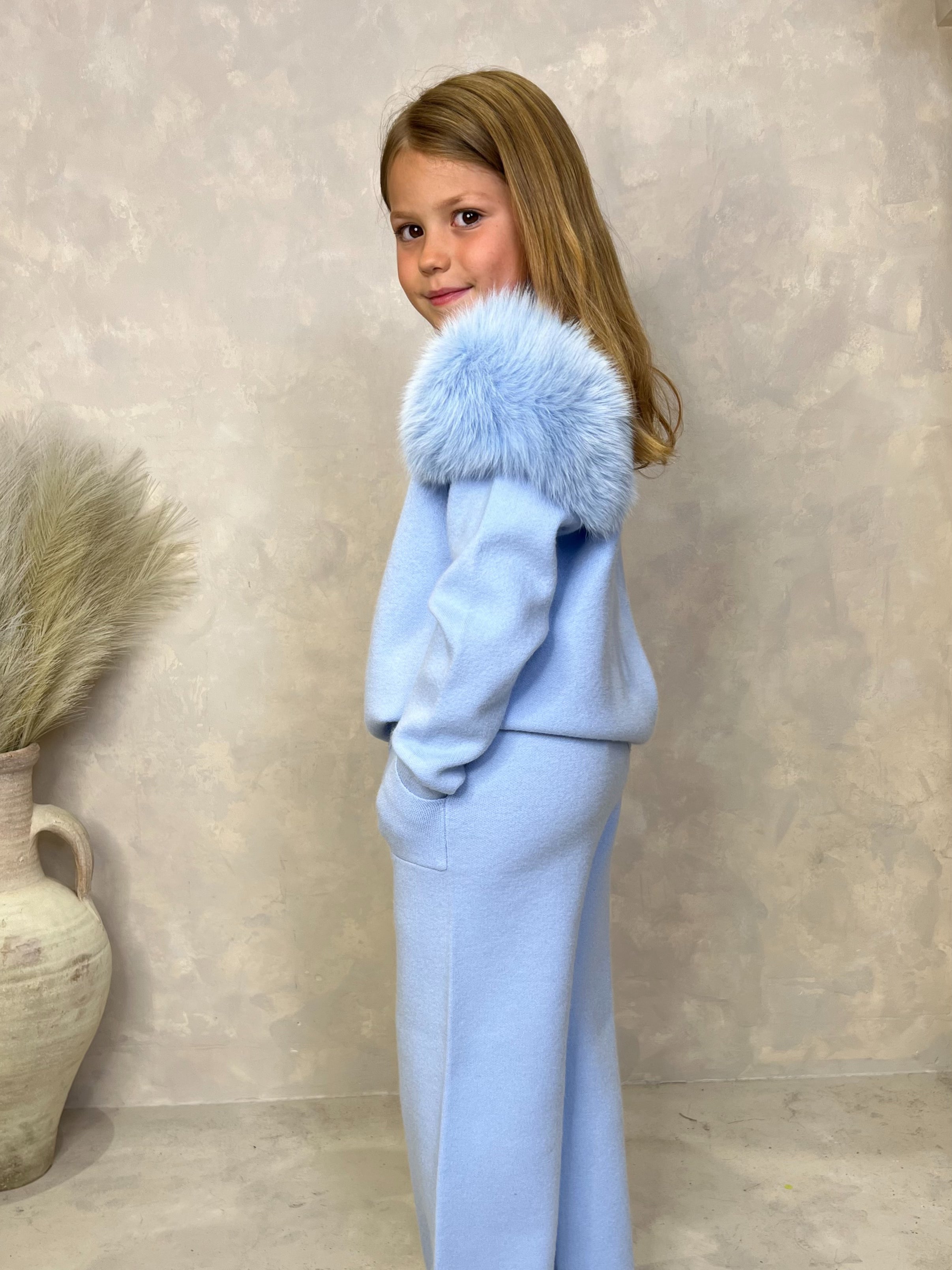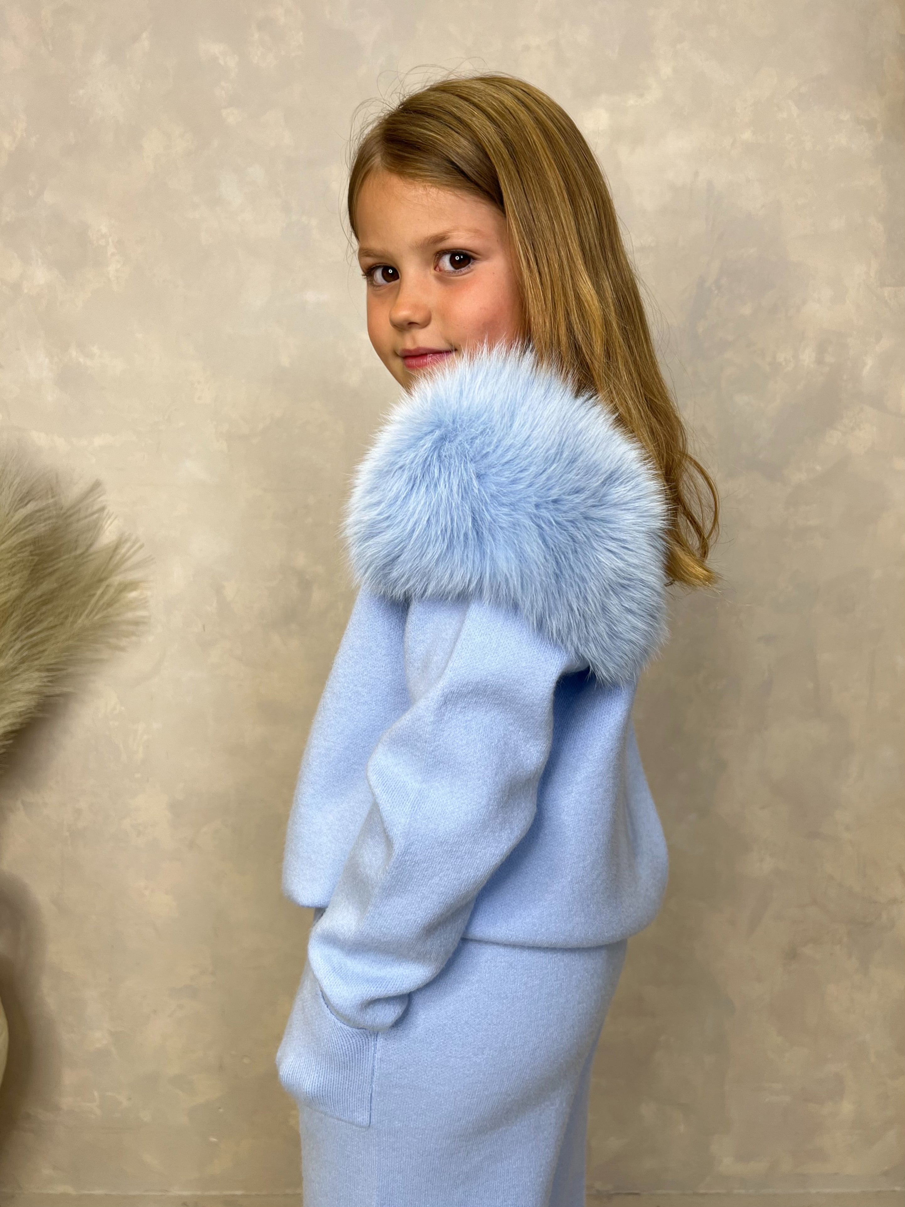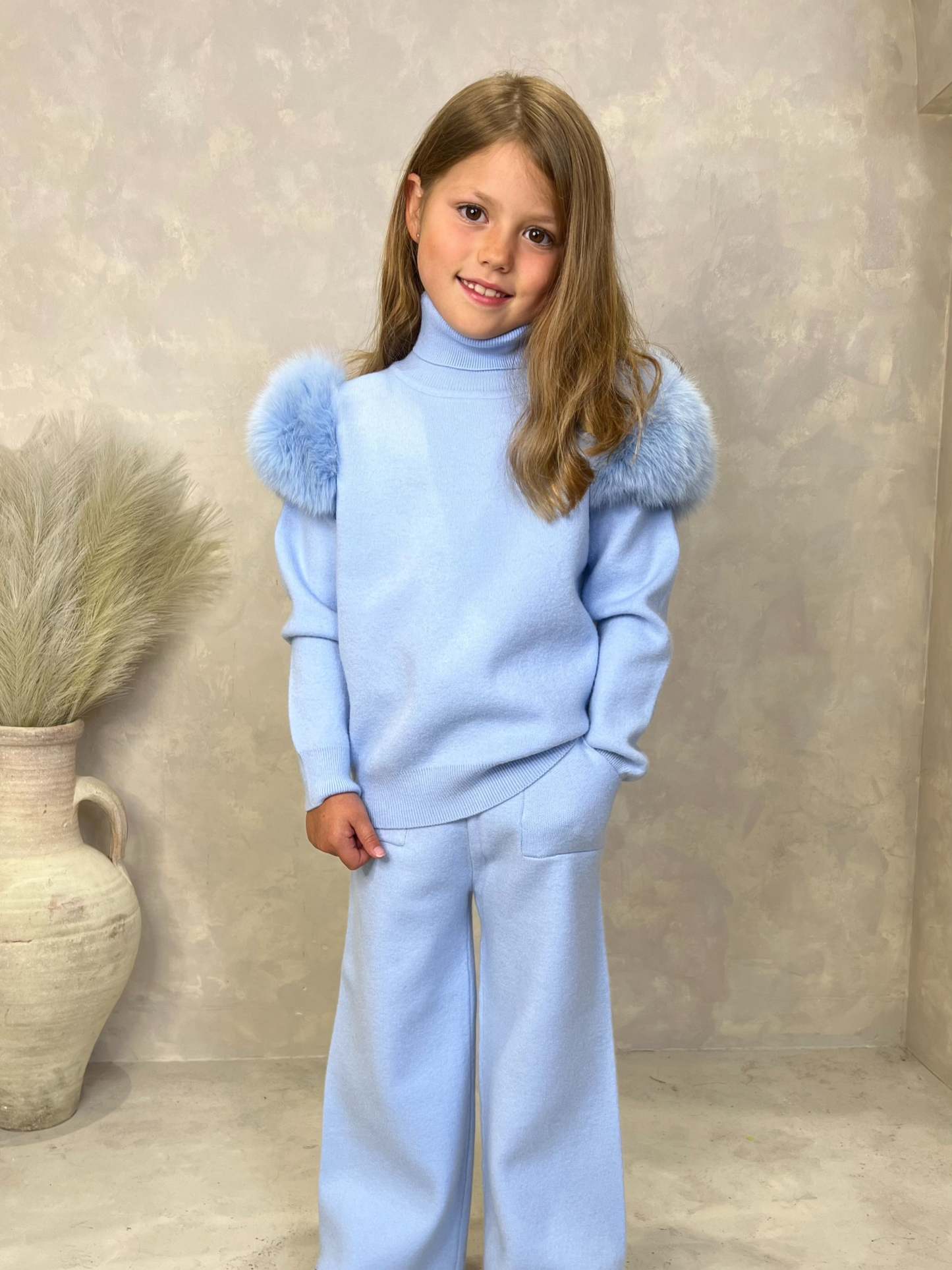 This Kids Luxury Fur Wide Leg Tracksuit features a detachable fur shoulder for added versatility and style. The wide leg design adds a touch of comfort and the stylish roll neck keeps your little one warm and cozy. Made with high quality fox fur for a luxurious look and feel.
