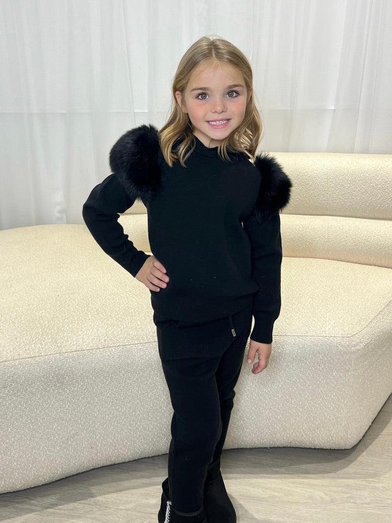 Indulge in ultimate comfort with our Kids Black Luxury Fur Loungewear Set. Made with the softest fabric and featuring real fur on the shoulder for a winter touch, this set is both stylish and cosy. Complete with a hood, tie waist joggers, and premium quality, it's the perfect lounge set for your little ones. Dry Clean Only.