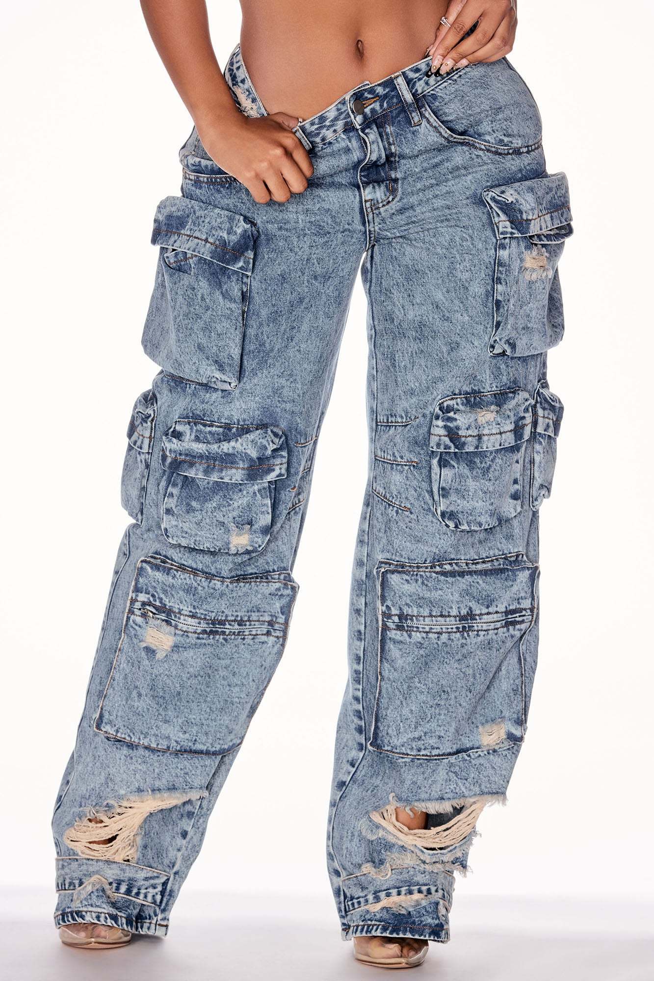 Nikki Non Stretch Acid Wash Cargo Jeans - Medium Wash