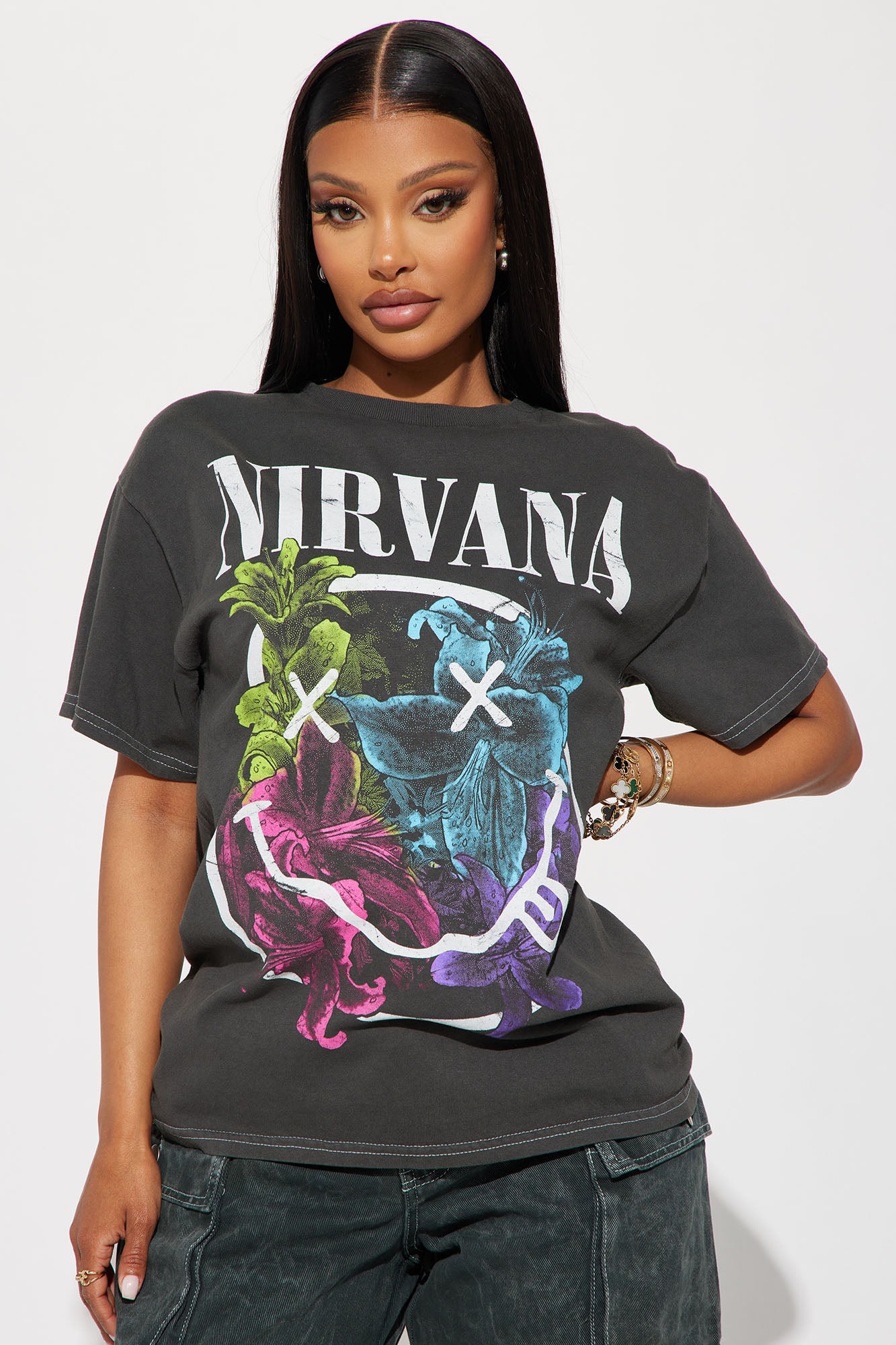 Nirvana Rainbow Floral Smiley Tee - Black Wash