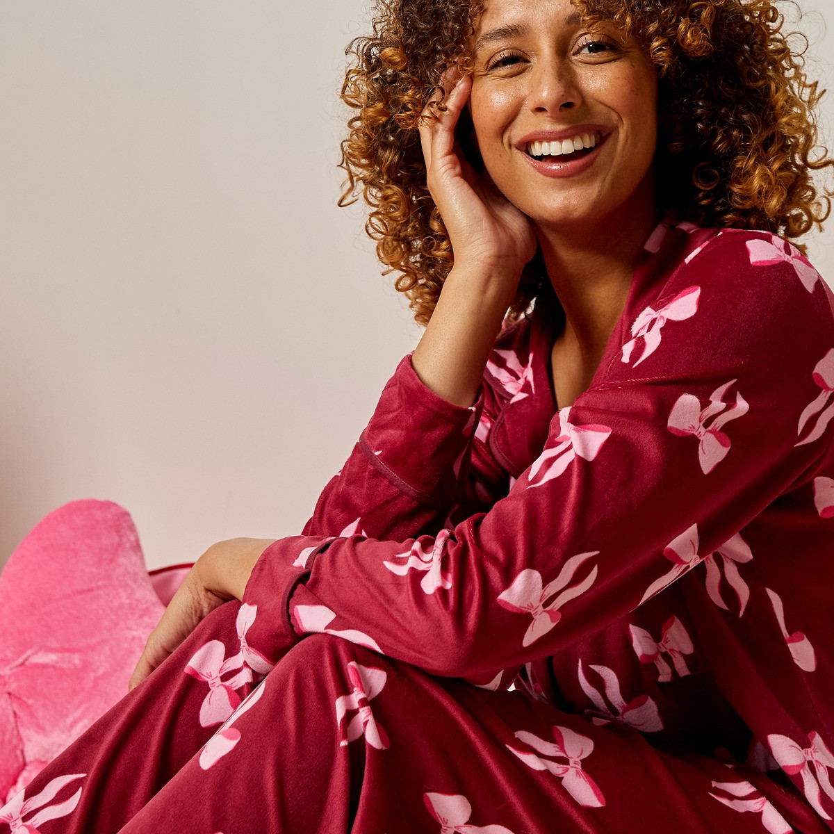 Add a sweet and stylish touch to your sleepwear with the Pink Bow Button Through Pyjama Set. Designed with a delicate bow print and classic button-up top, this charming set brings together elegance and comfort. The relaxed fit makes it perfect for unwinding at the end of the day, while the matching bottoms complete the coordinated look. Whether you're getting ready for bed or enjoying a quiet morning, this set is a lovely addition to your loungewear collection.