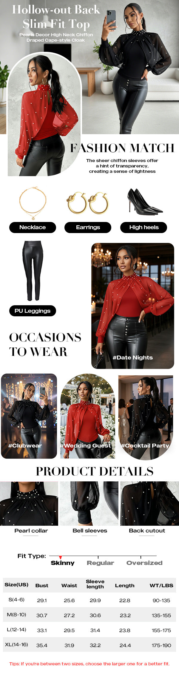 Design Details: Features a high neck with ruched detailing and pearl embellishments on both the collar and draped shoulder overlay. The back has a subtle hollow-out for a delicate, playful touch, adding dimension to the otherwise sleek silhouette.