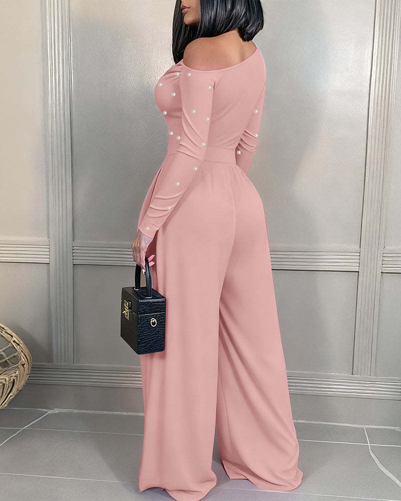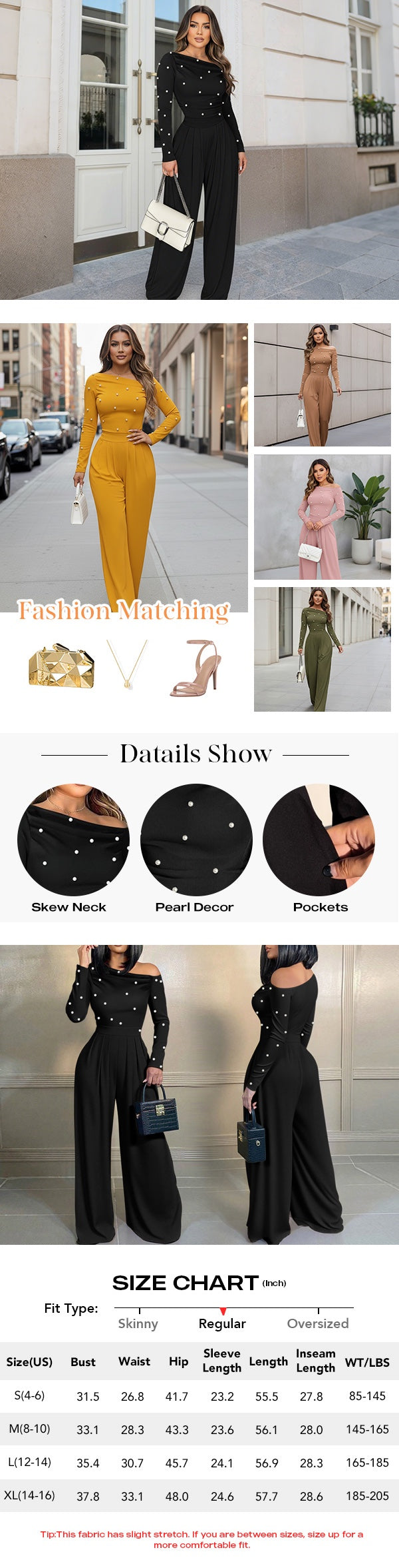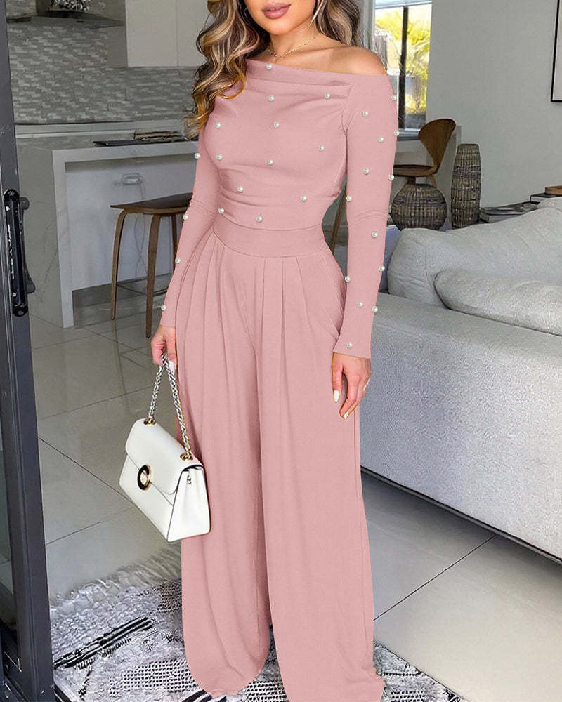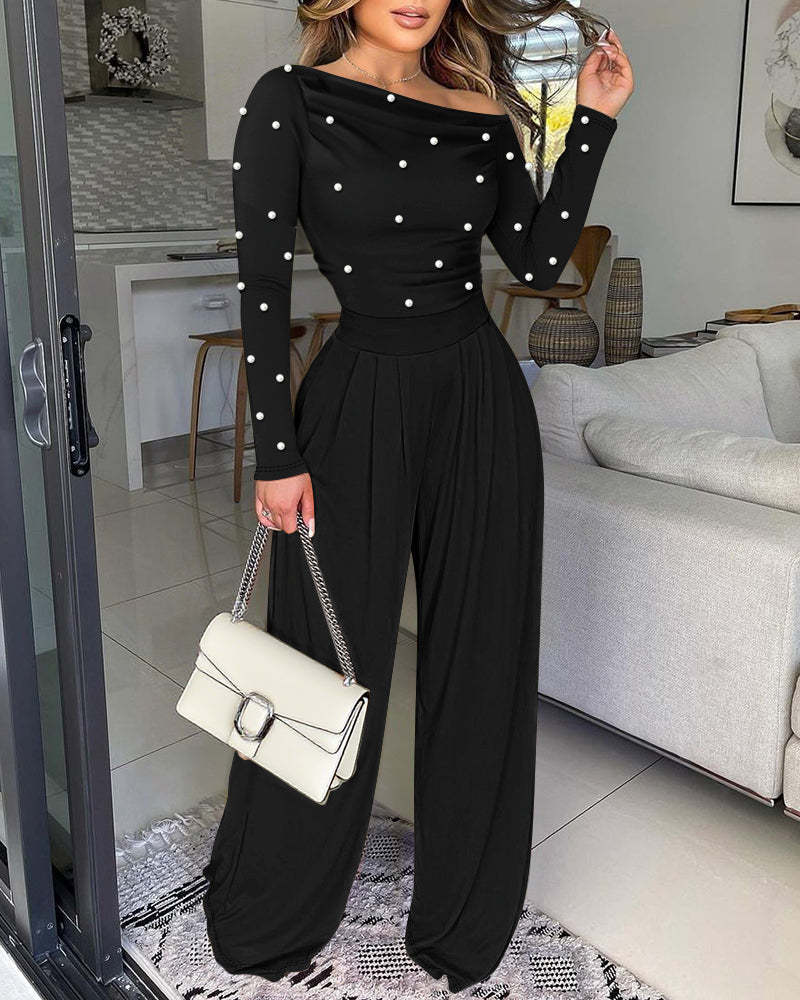 Silhouette & Fit: The skew-neckline highlights the collarbone and shoulder line, while the cinched high waist with wide-leg pants creates a flattering, elongated silhouette.