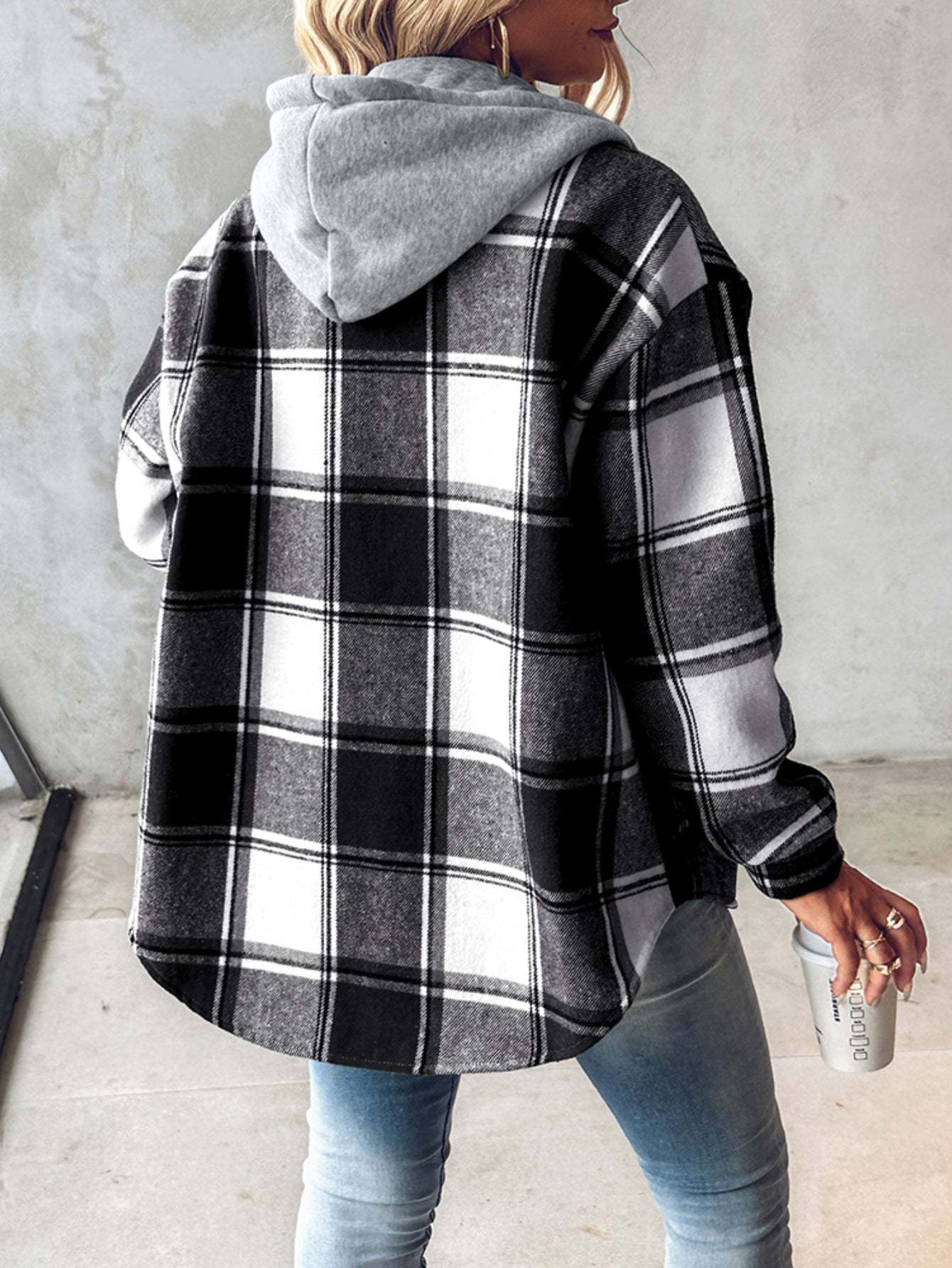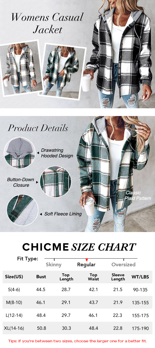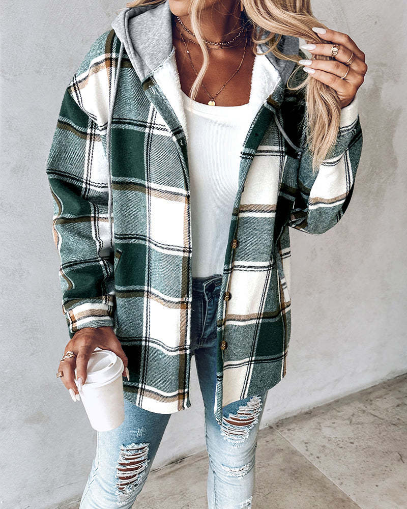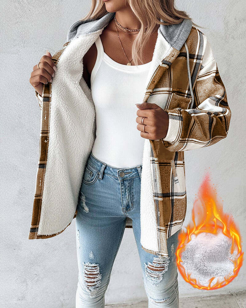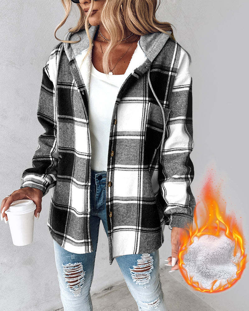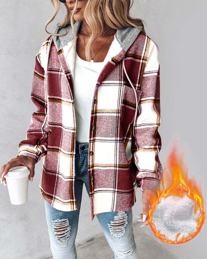 Plaid Pattern Long Sleeve Shacket Button Down Fleece Lined Hooded Jackets Warm Coat