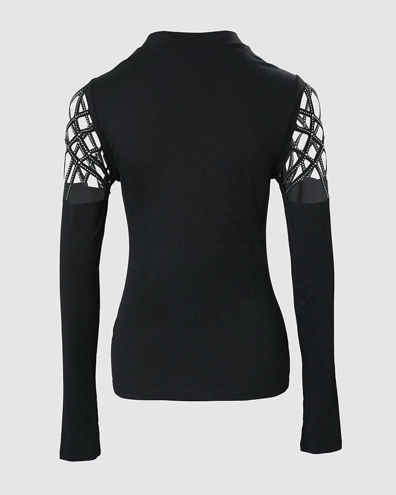 Design Details: Hollow-out panels on the shoulders and upper sleeves are embellished with sparkling rhinestones, adding a touch of glamour. Thumb hole cuffs lend a modern, edgy detail, while the sweetheart-inspired neckline subtly enhances the feminine appeal.