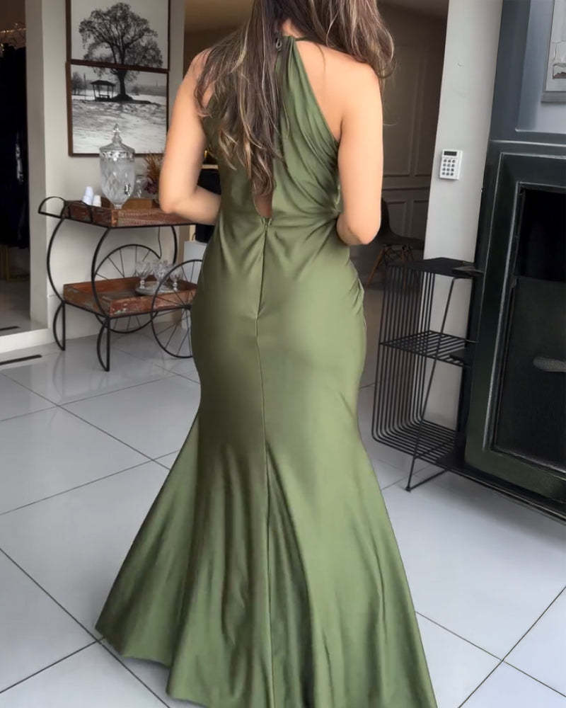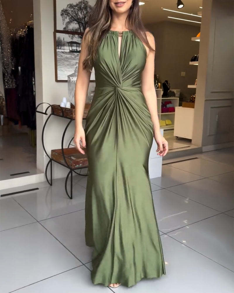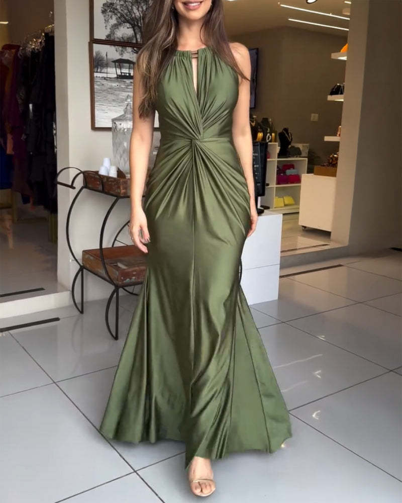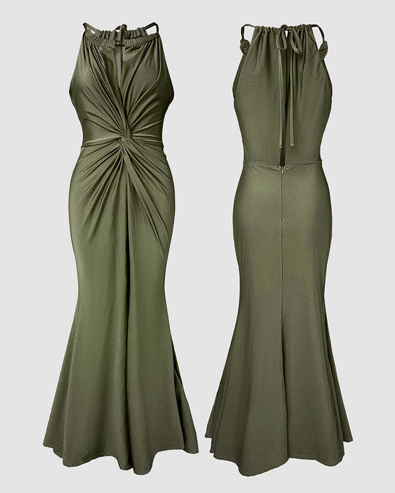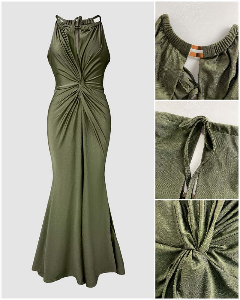 Satin Sleeveless Hollow-out Twist Front Evening Dress Tied Detail Backless Zipper Back Mermaid Hem Dress
