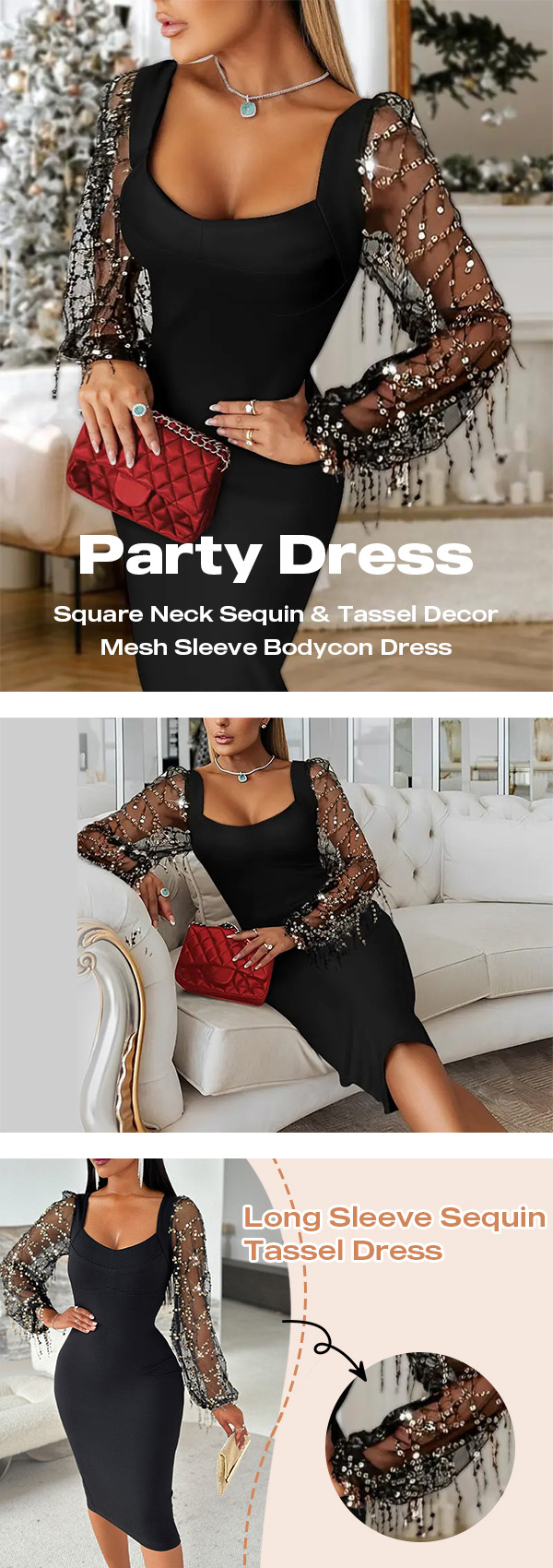Square Neck Sequin & Tassel Decor Mesh Sleeve Bodycon Dress Zipper Back Party Dress