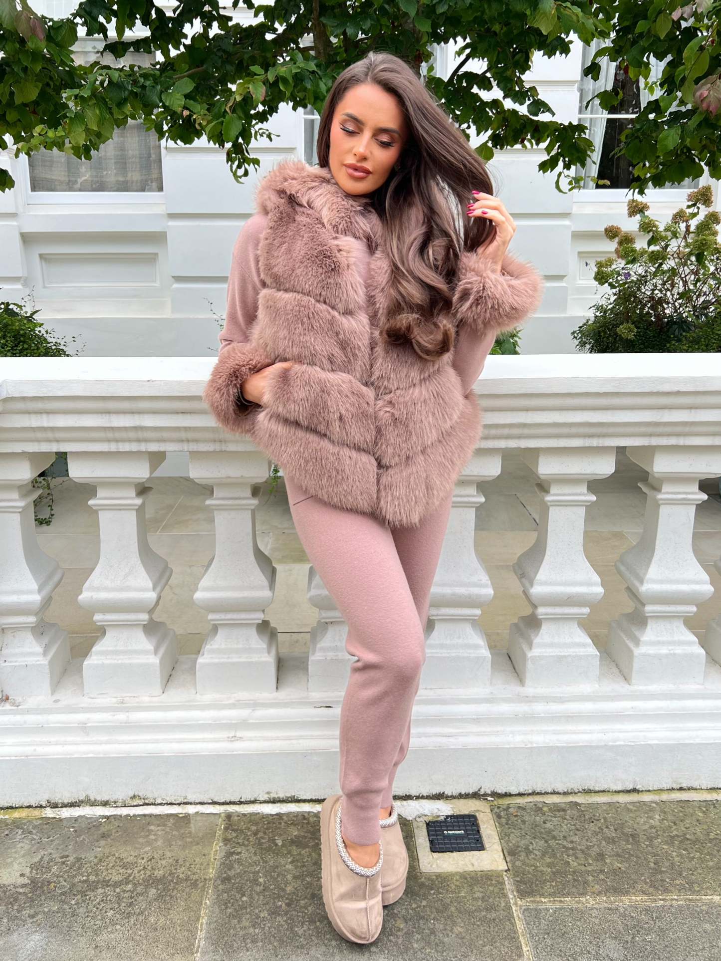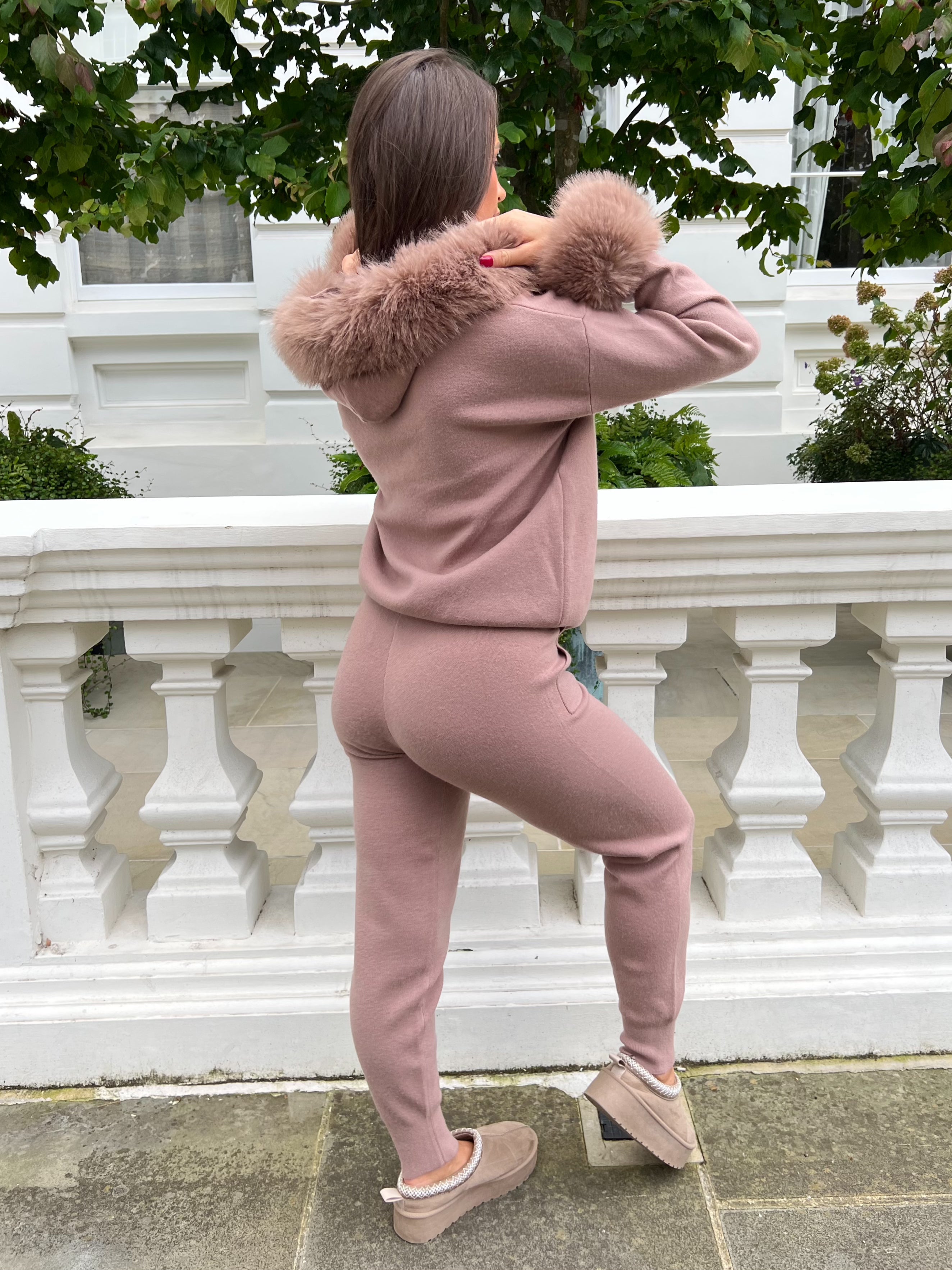 Expertly crafted for comfort and style, our Taupe Premium Faux Fur Trim Hood & Cuff Jogger Tracksuit features a drawstring waist and jogger bottoms for a personalized fit. The premium faux fur trim on the hood and cuffs adds a touch of luxury to this versatile tracksuit.