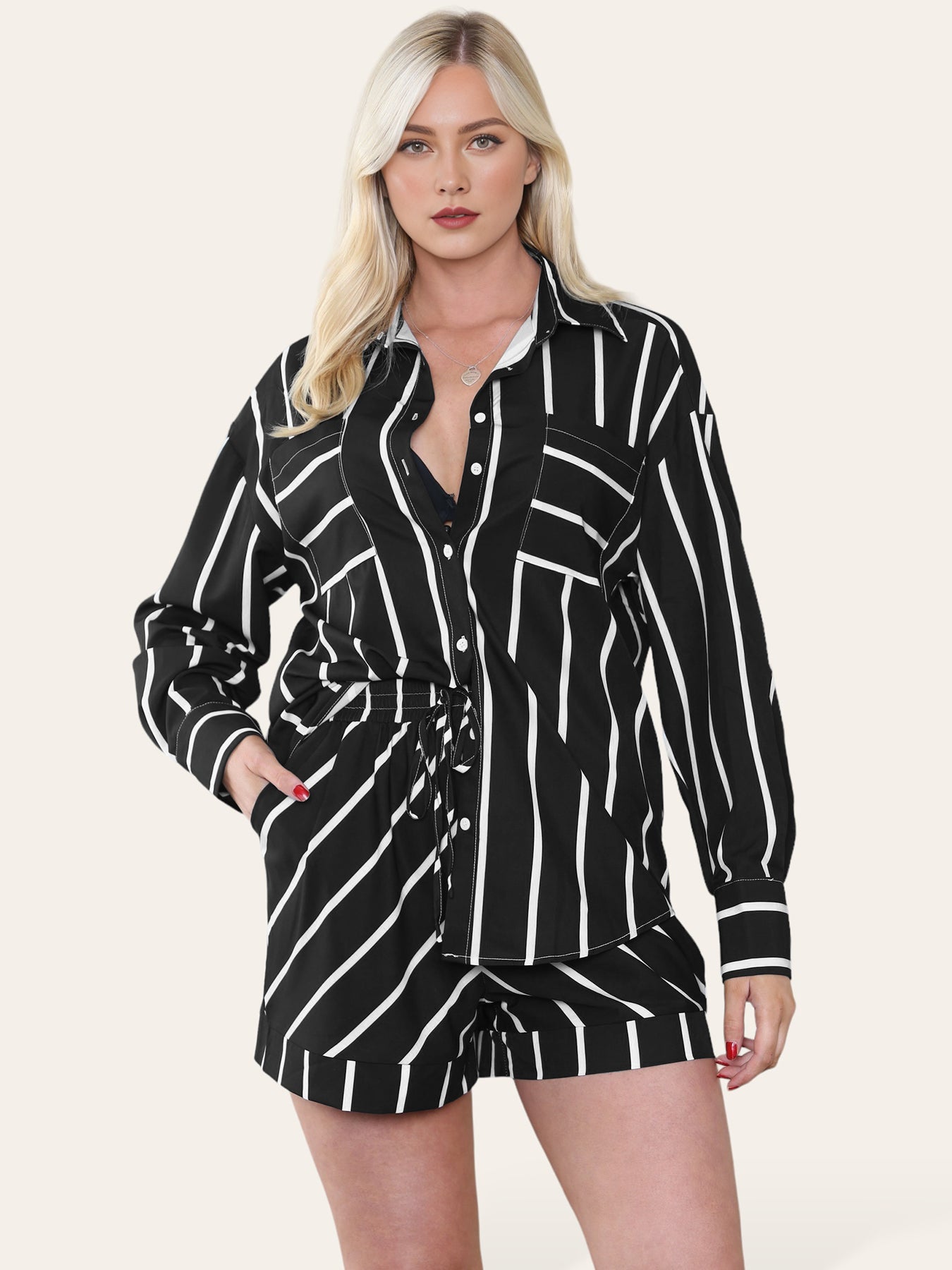Trendy Color Matching Stripe Patch Pocket Button-Up Long Sleeve Shirt & Wide Leg Shorts Co-ord