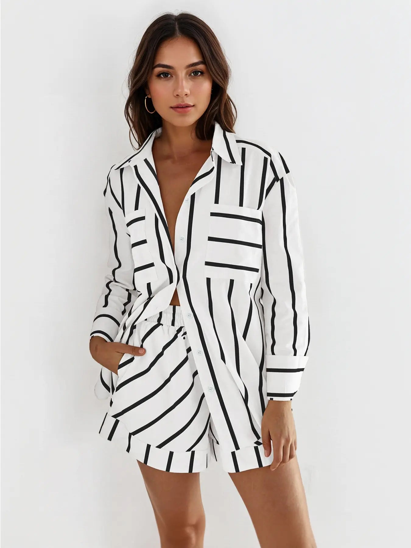 The shirt has a collared neck, front patch pockets, long sleeves with button - up. The shorts have an elastic waist, side pockets, wide legs, and both are in soft, color - matching stripe fabric. Comfortable for summer and fall, it blends style and comfort well.