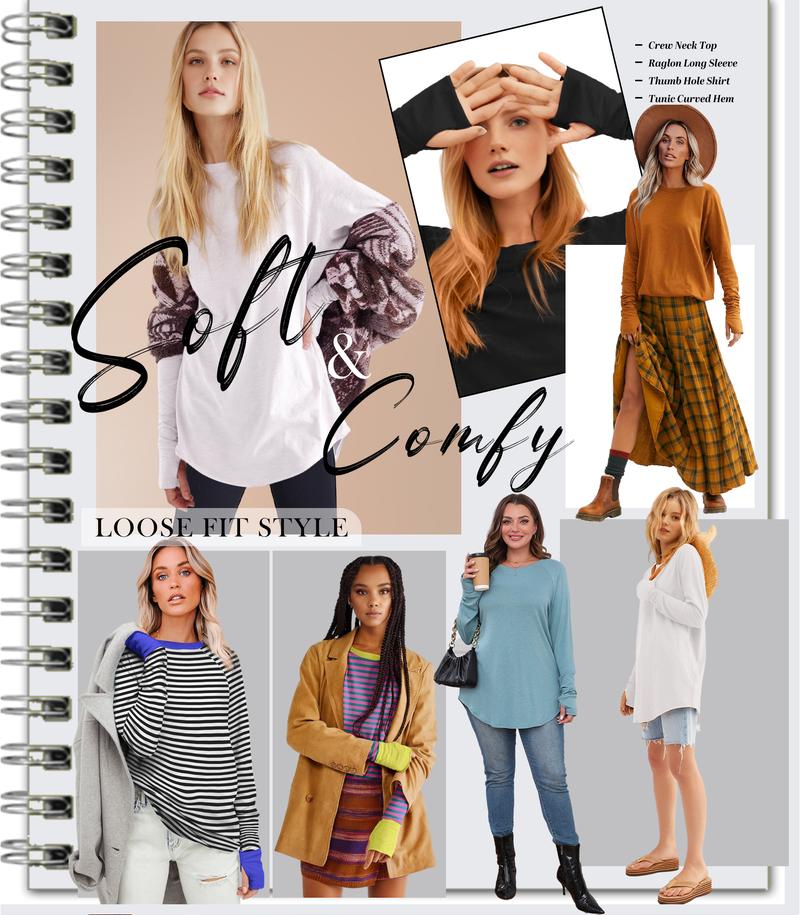 Design B·Classic round neck Long sleeves (no thumb holes)·Side splits and curved hem·Loose fit for a casual, flattering look·Straight shoulder seam