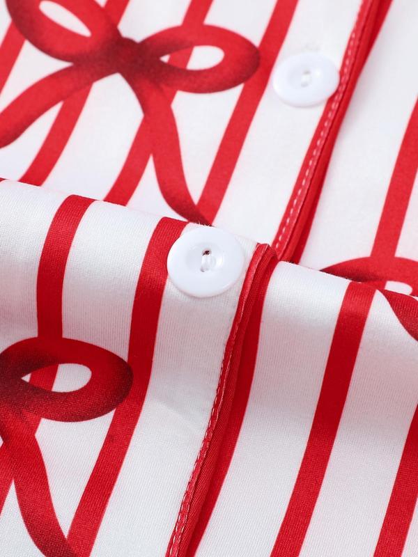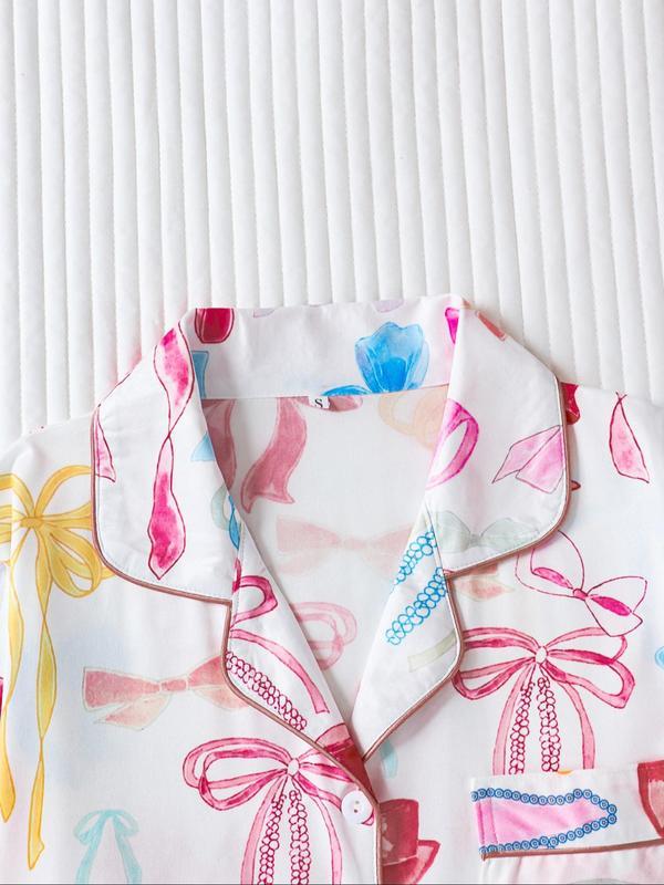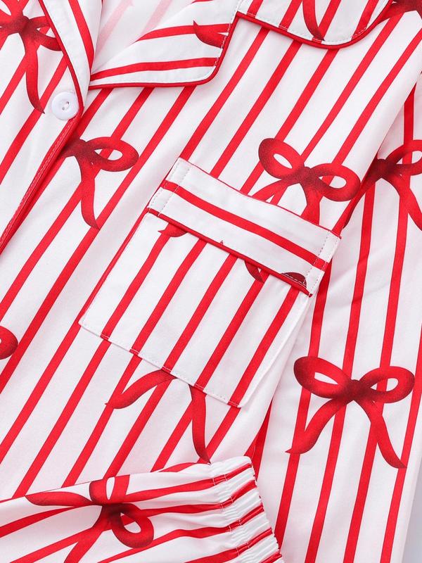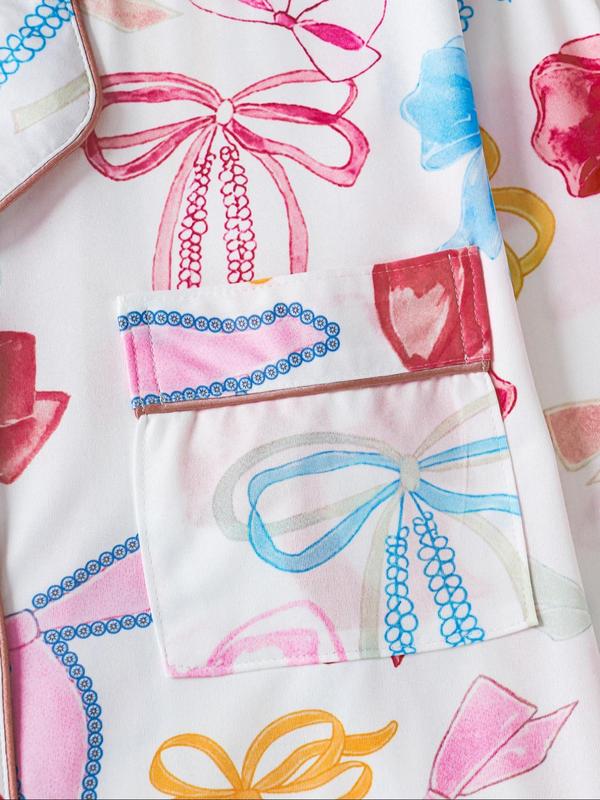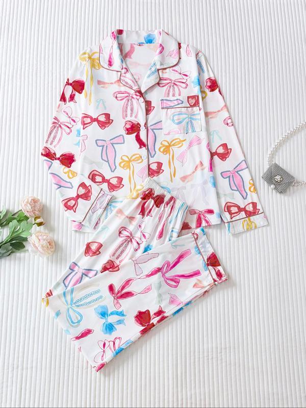 Two-piece Set Women's Bow Print Button Front Pocket Shirt & Elastic Waist Pants Pajama, Casual Comfy Long Sleeve Lapel Neck Top & Trousers Pj Set, Ladies Sleepwear for Spring & Fall