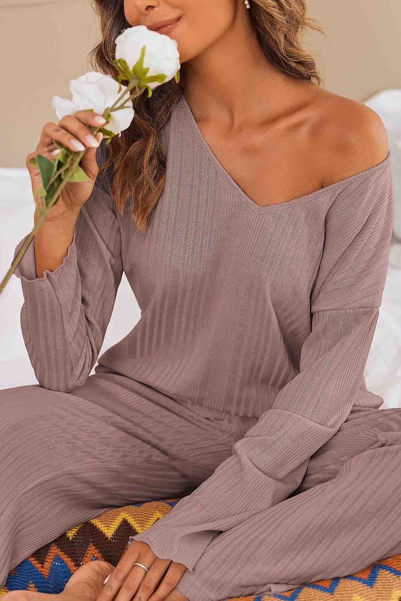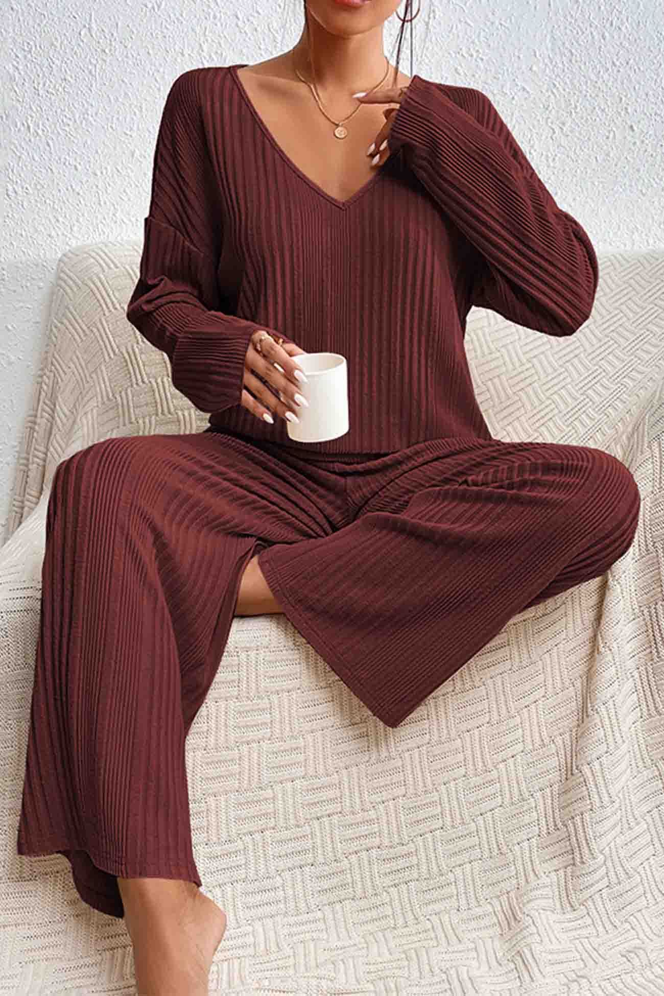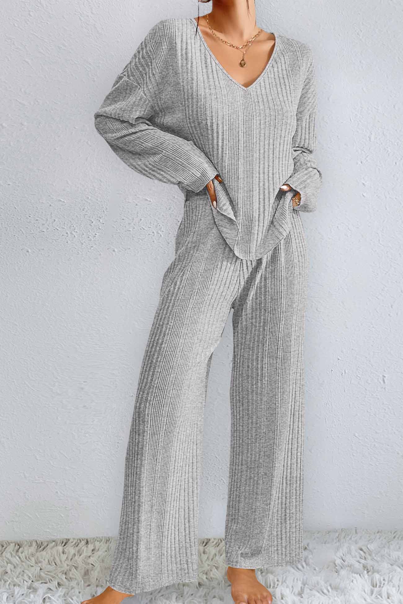 V Neck Ribbed Long Sleeve Two-Piece Set