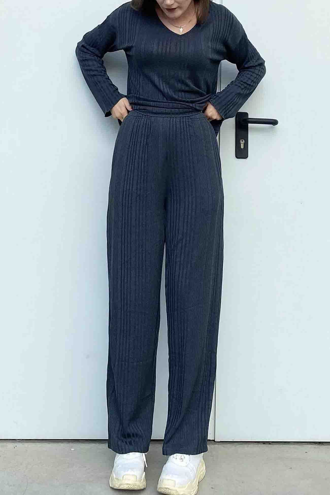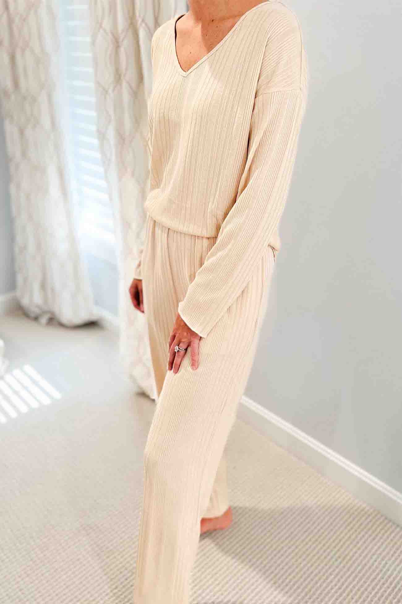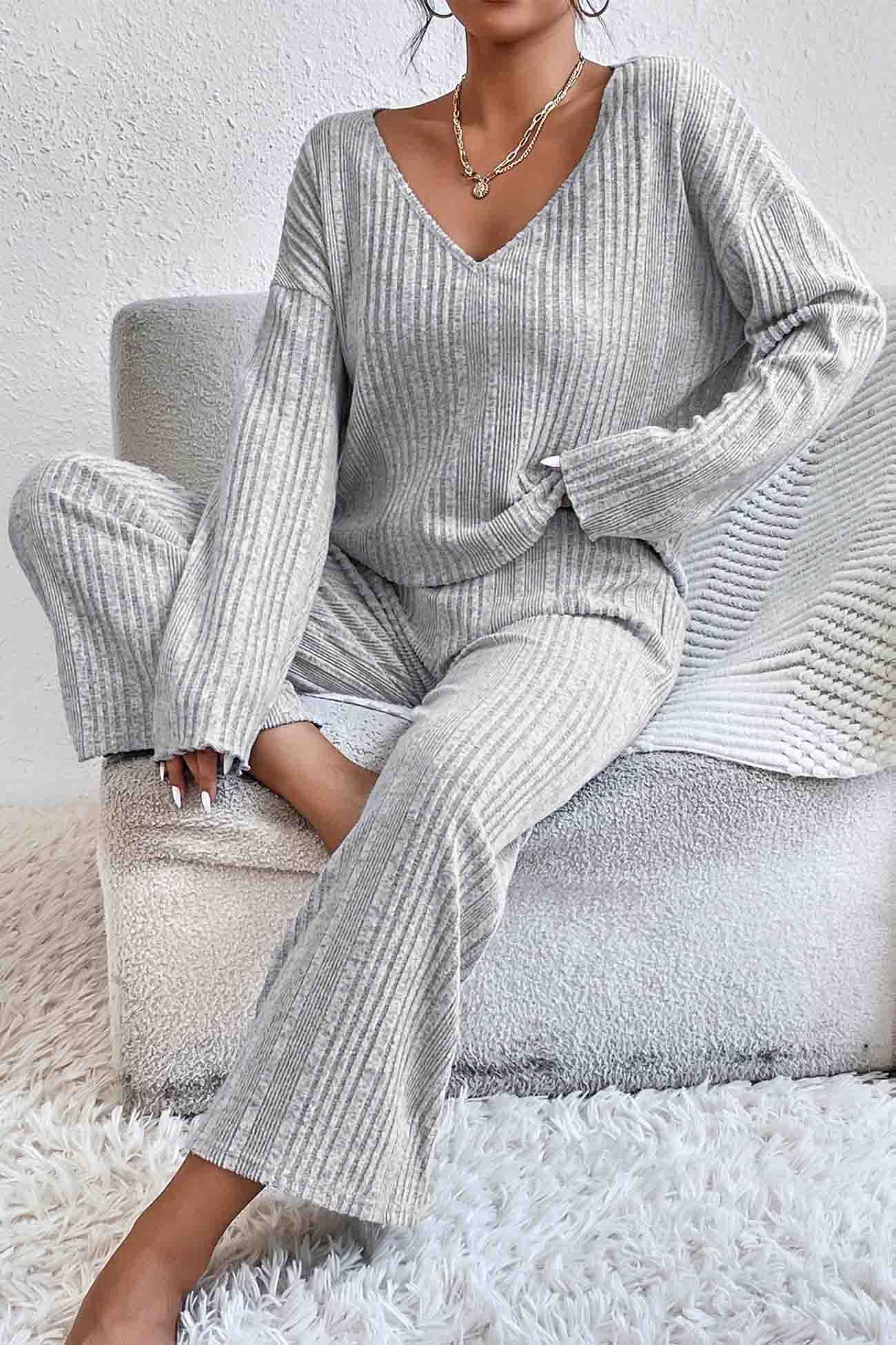 V Neck Ribbed Long Sleeve Two-Piece Set