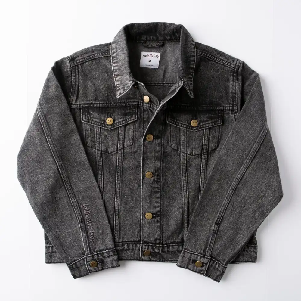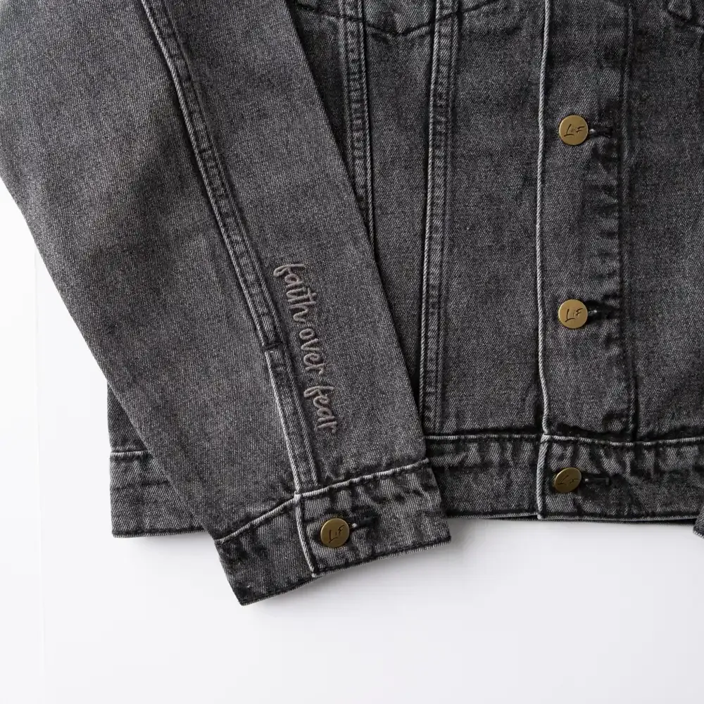 Introducing our Faith Over Fear embroidered, vintage wash denim jacket, a wardrobe staple that effortlessly combines classic style with your Christian values. From casual gatherings to weekend outings, this jacket complements various outfits. Pair it with jeans, skirts, or dresses to bring a touch of faith to your everyday ensemble.