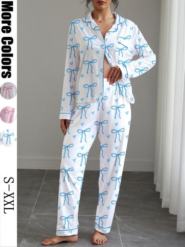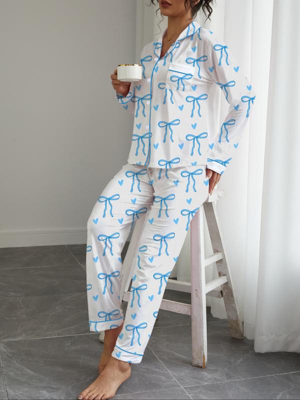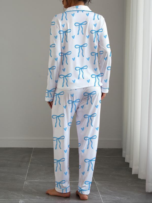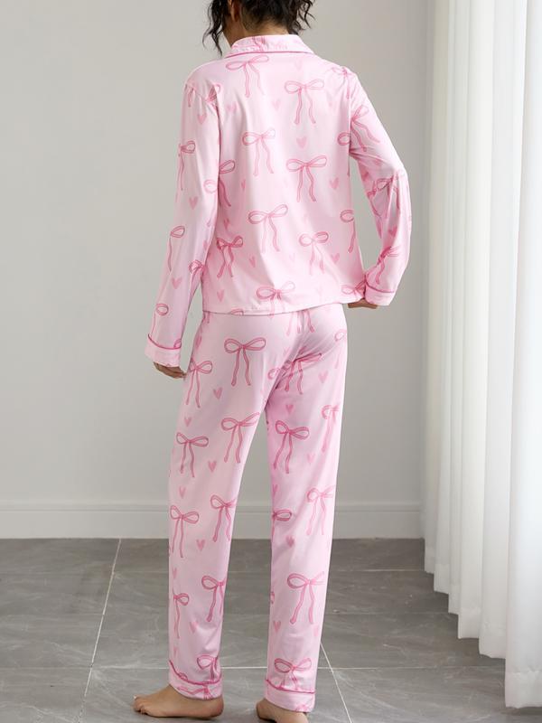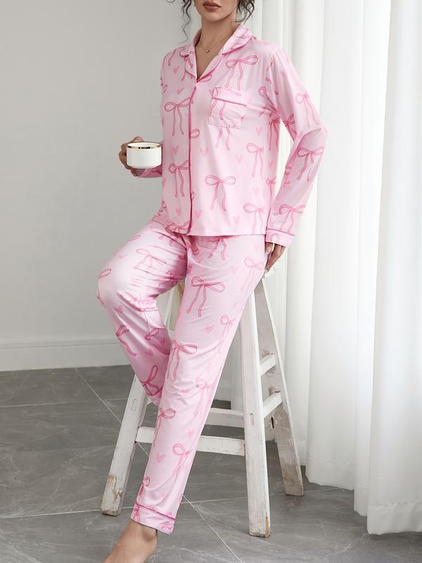 Women's Cute Bow Print Pajama Set, Fall & Winter Casual Homewear, Soft Elastic Fabric, Long Sleeve Shirt Collar Top & Pants, Womenswear