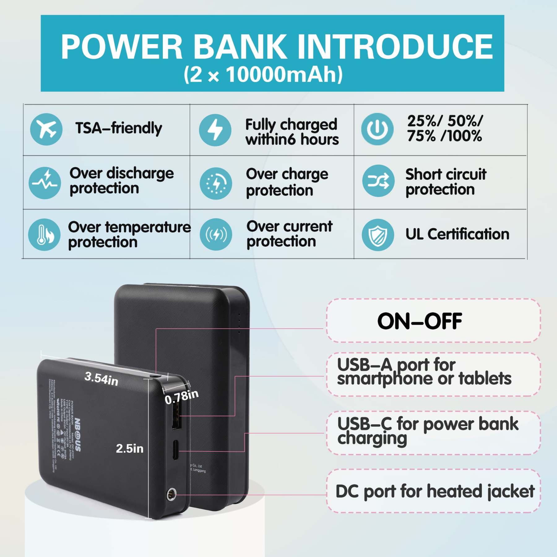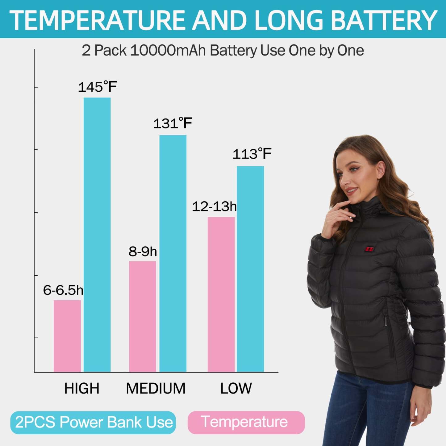 This heated jacket comes with 2 rechargeable 10000mAh power banks (EU standard 5V/2A output). Each power bank can be used separately or alternately for extended warmth — lasting 6–6.5 hours on High (145°F / 63°C), 8–9 hours on Medium (131°F / 55°C), and 12–13 hours on Low (113°F / 45°C).