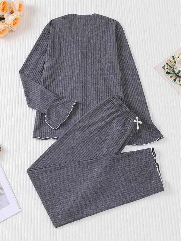 Women's Long Sleeve Top & Pants Pajama Set, Casual Comfy Bow Top & Trousers Pajama Set, Ladies Sleepwear for All Seasons