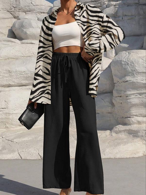 Women's Solid Color Button-Up Shirt and Drawstring Wide-Leg Pants Set