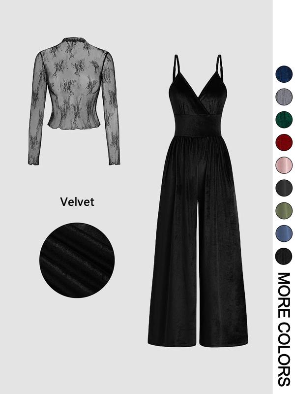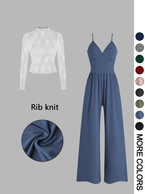 Women's Solid Color Lace Tee & Pocket Jumpsuit Two-piece Set, Elegant Fashion Casual Zipper Back Cami Jumpsuit & Long Sleeve Top for Daily Outdoor Wear, Women's Clothing for Spring & Fall