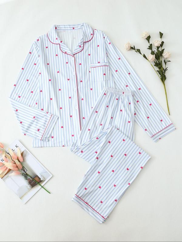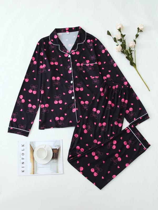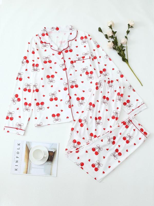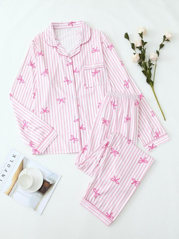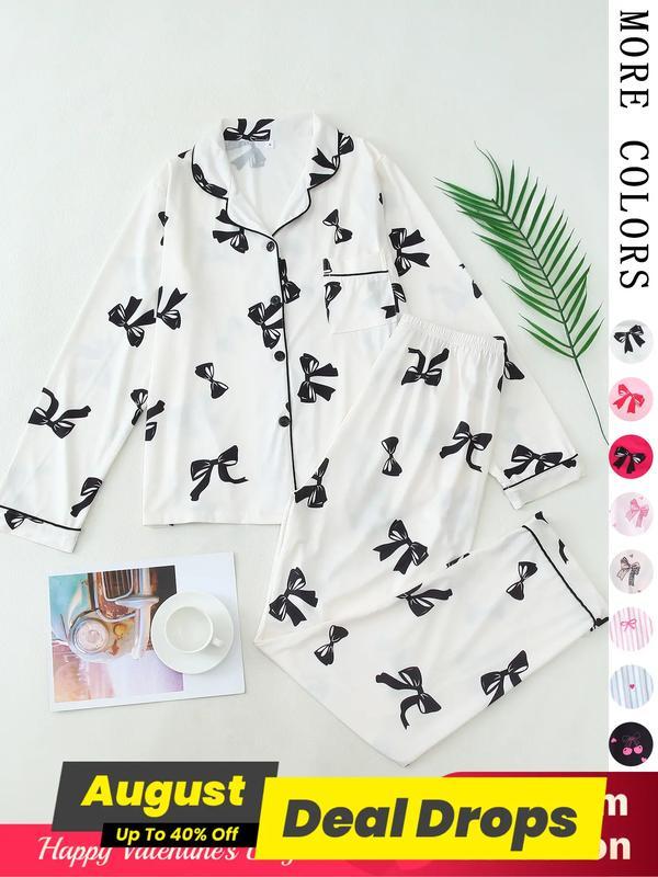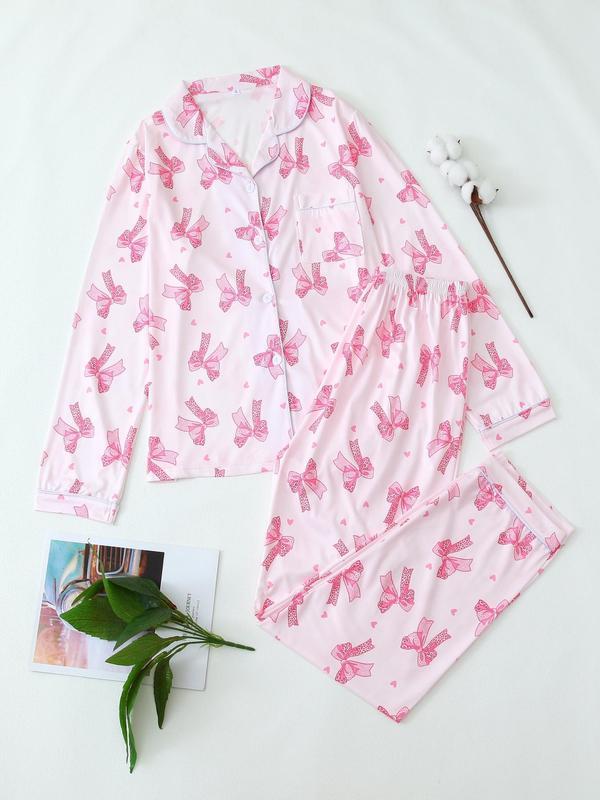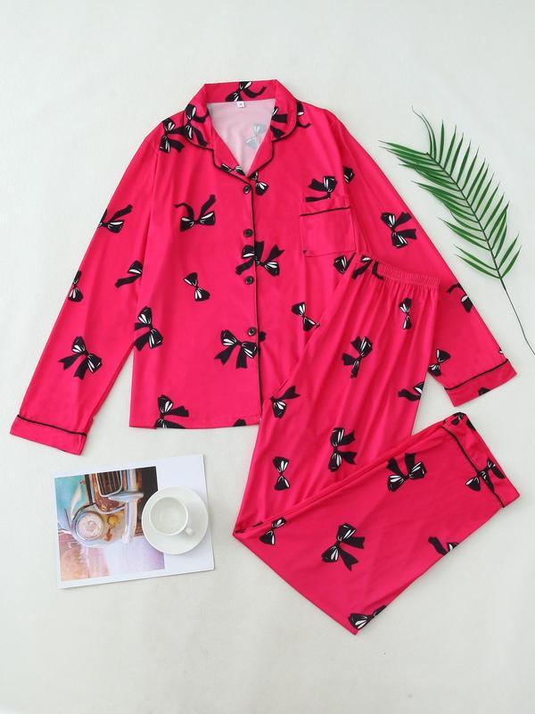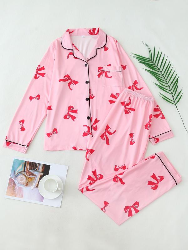 Christmas pyjamas Two-Piece Set Women's All Over Bow Print Lapel Neck Pocket Shirt & Pants Pyjama, Casual Comfy Long Sleeve Top & Trousers PJ Set, Women's Sleepwear for Spring & Fall Pajamas